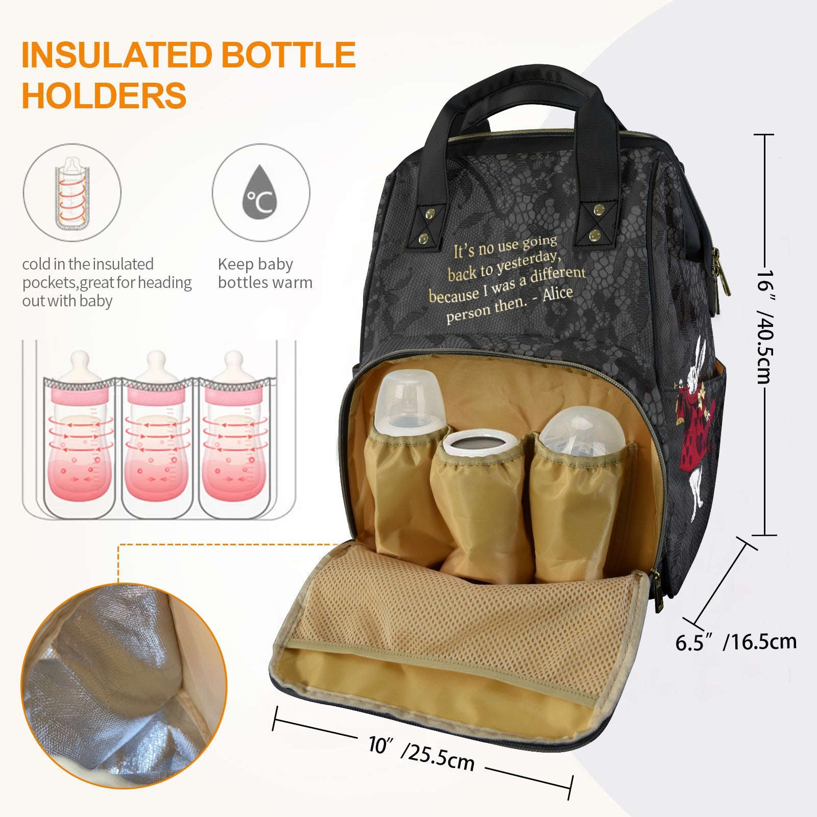 Alice in Wonderland Large Backpack Diaper Bag - Black Red and Gold Nappy Bag