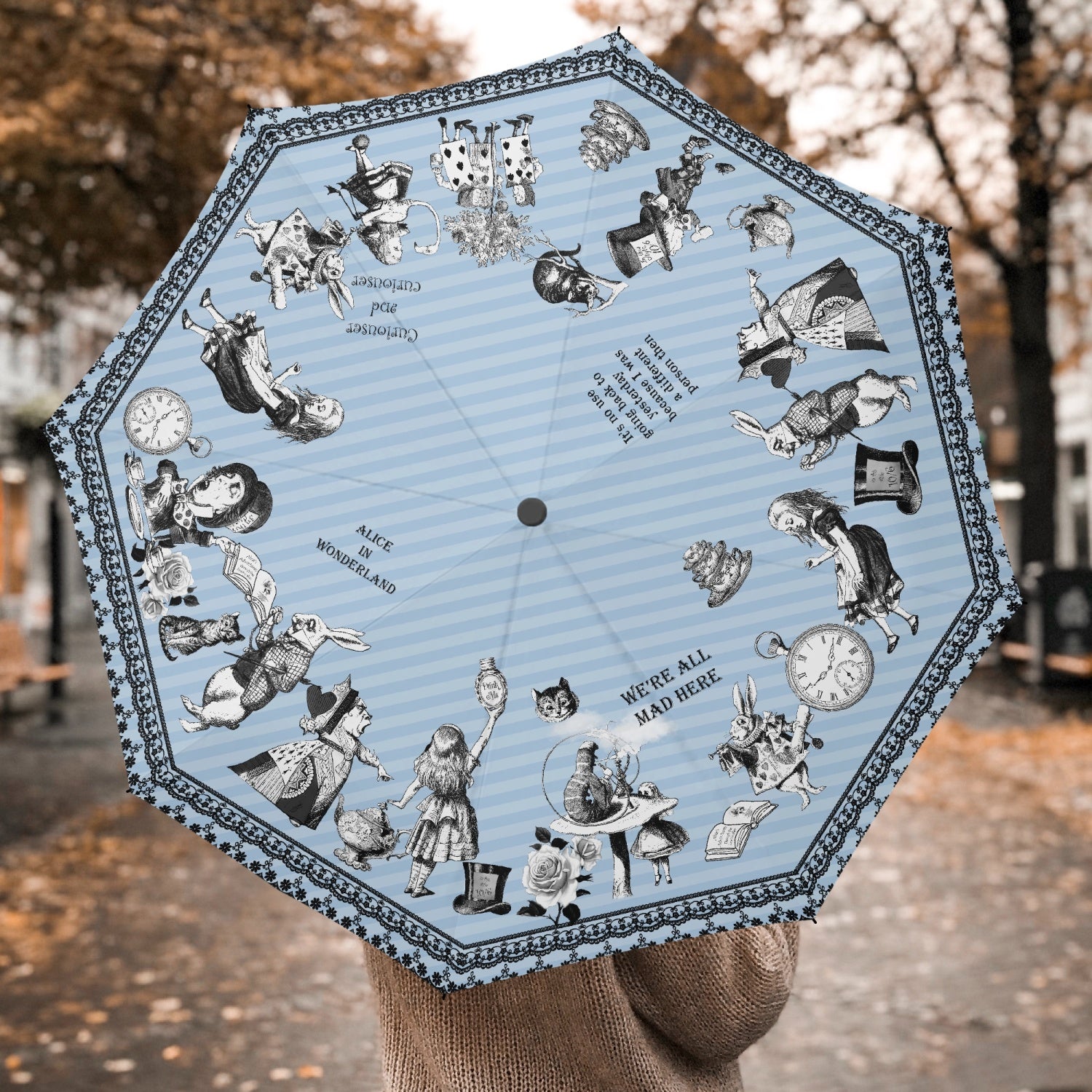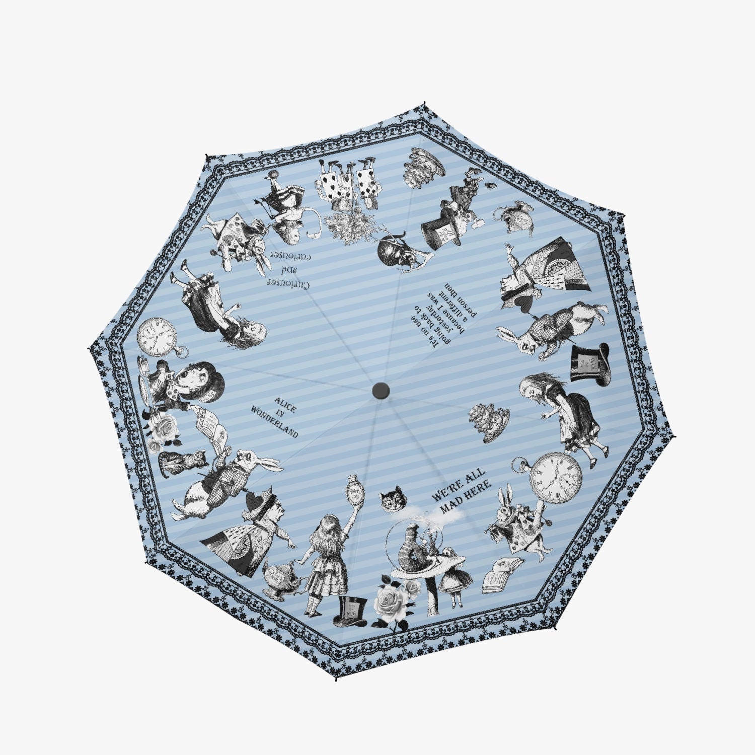 The perfect gift for Alice fans everywhere.  A compact folding umbrella custom printed with many of the Alice in Wonderland characters on a soft blue striped background.  You'll find the Queen of Hearts, White Rabbit, Alice tumbling down the Rabbithole, teapots, tea cups and top hats along with quotes from the Lewis Carroll classic.