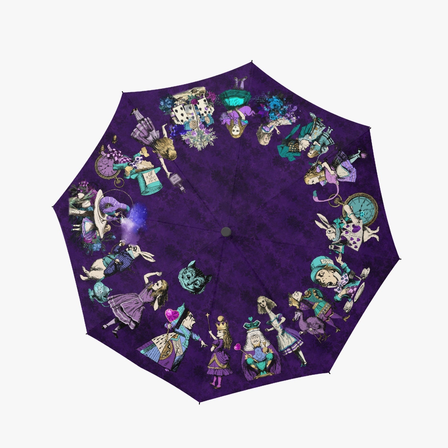 Bring a touch of Alice in Wonderland adventure to a rainy day with the Purple Alice compact automatic umbrella.  Just the right size to fit into your purse or backpack.