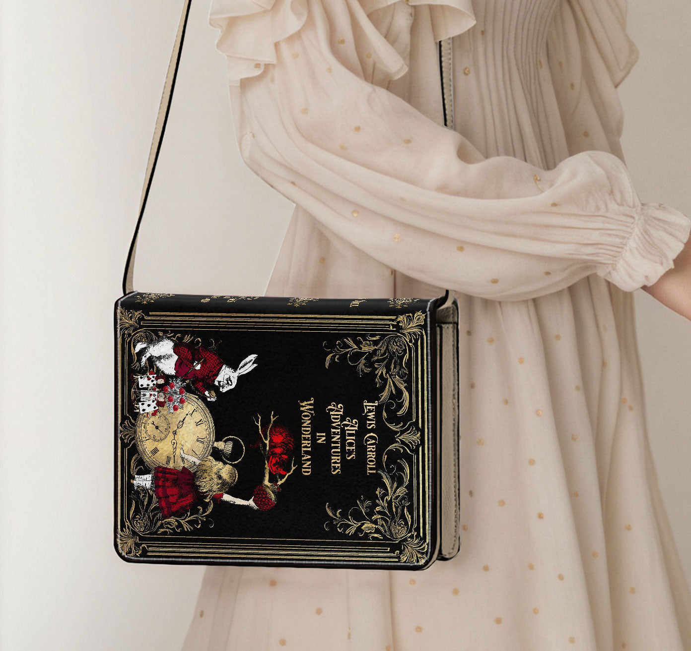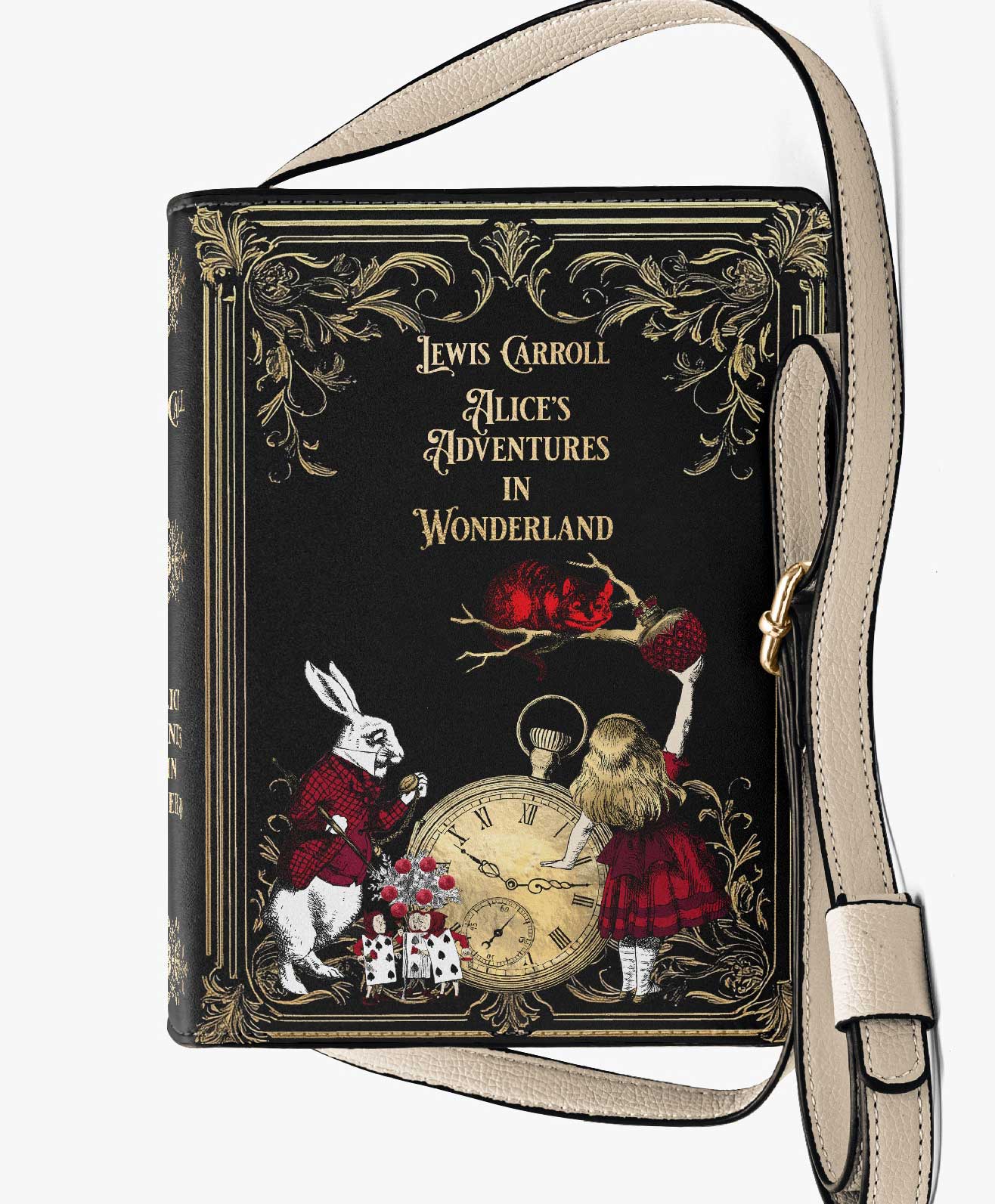 This cute shoulder bag is custom printed to look like a book - Lewis Carrolls, Alice's Adventures in Wonderland, making it a perfect accessory for book lovers and Alice Fans.