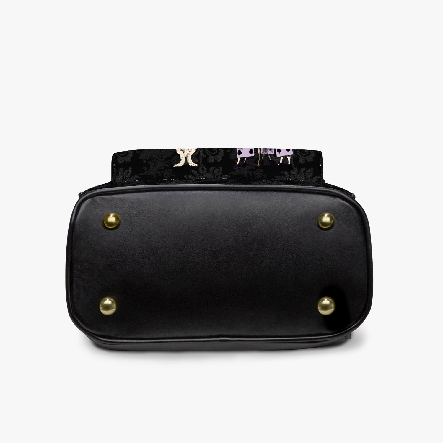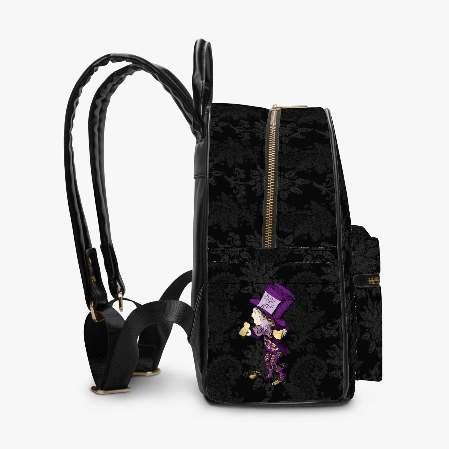 Alice in Wonderland classic characters custom printed in purples and black on a small cute backpack, perfect for your adventures down the Rabbit hole.