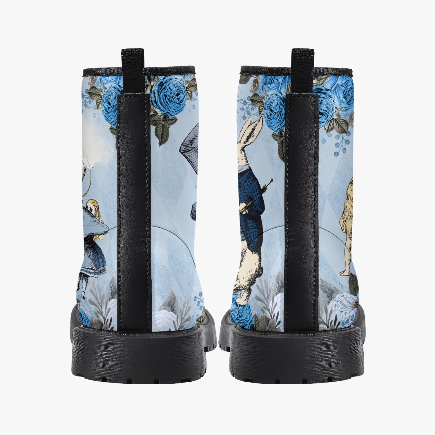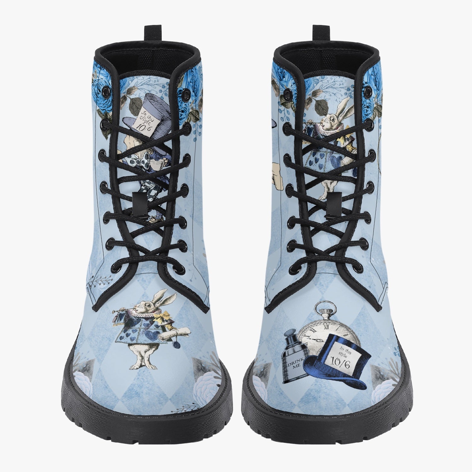 A pale blue Alice in Wonderland adventure story boot. You'll find Alice reaching for the Drink me bottle, with the Mad Hatter, White Rabbit and Caterpillar printed and then lovingly handcrafted into these extra comfortable combat style boots.