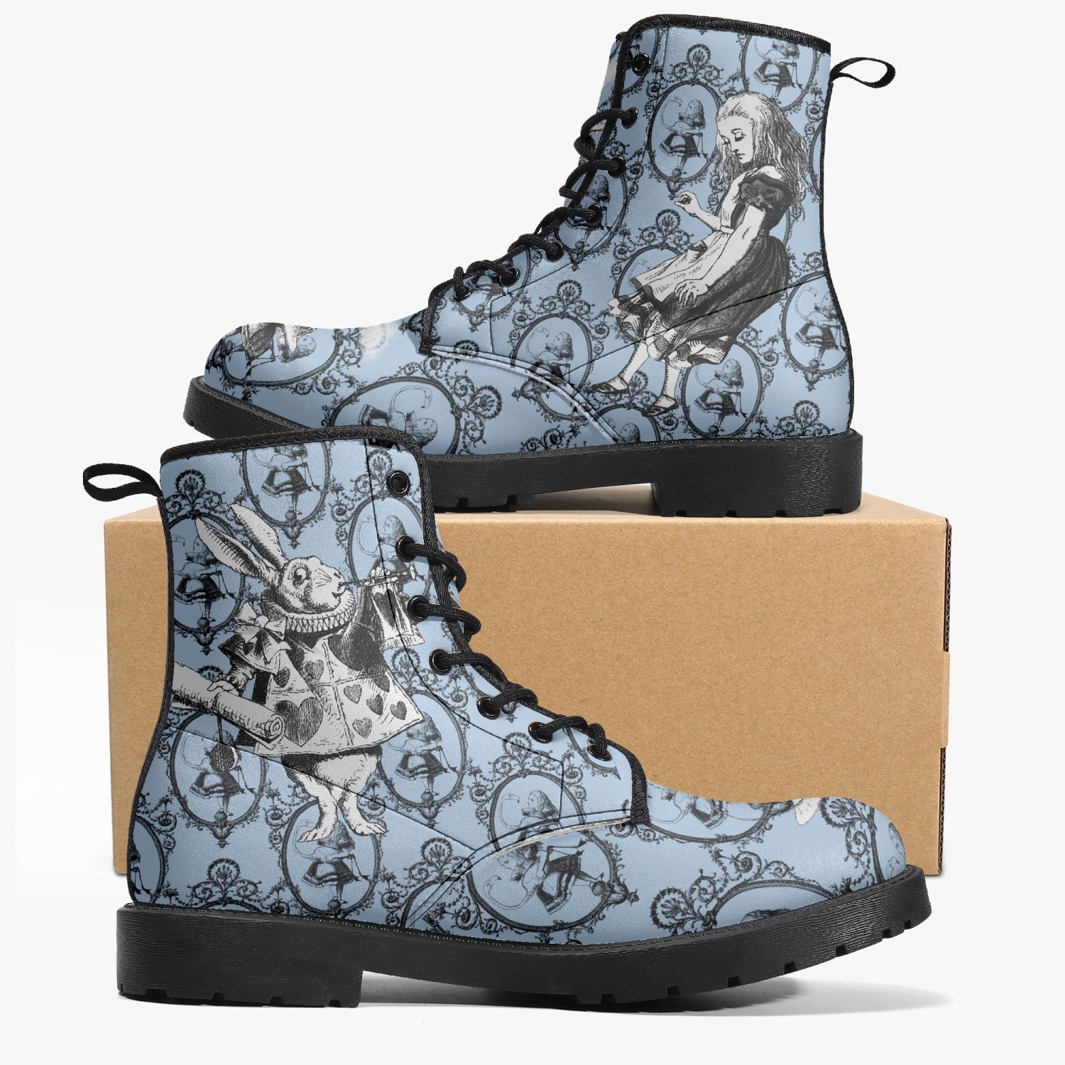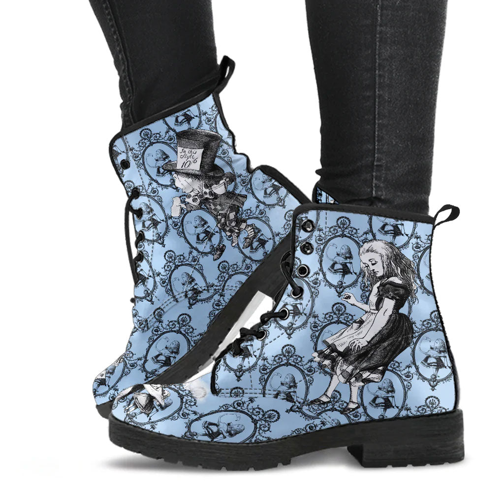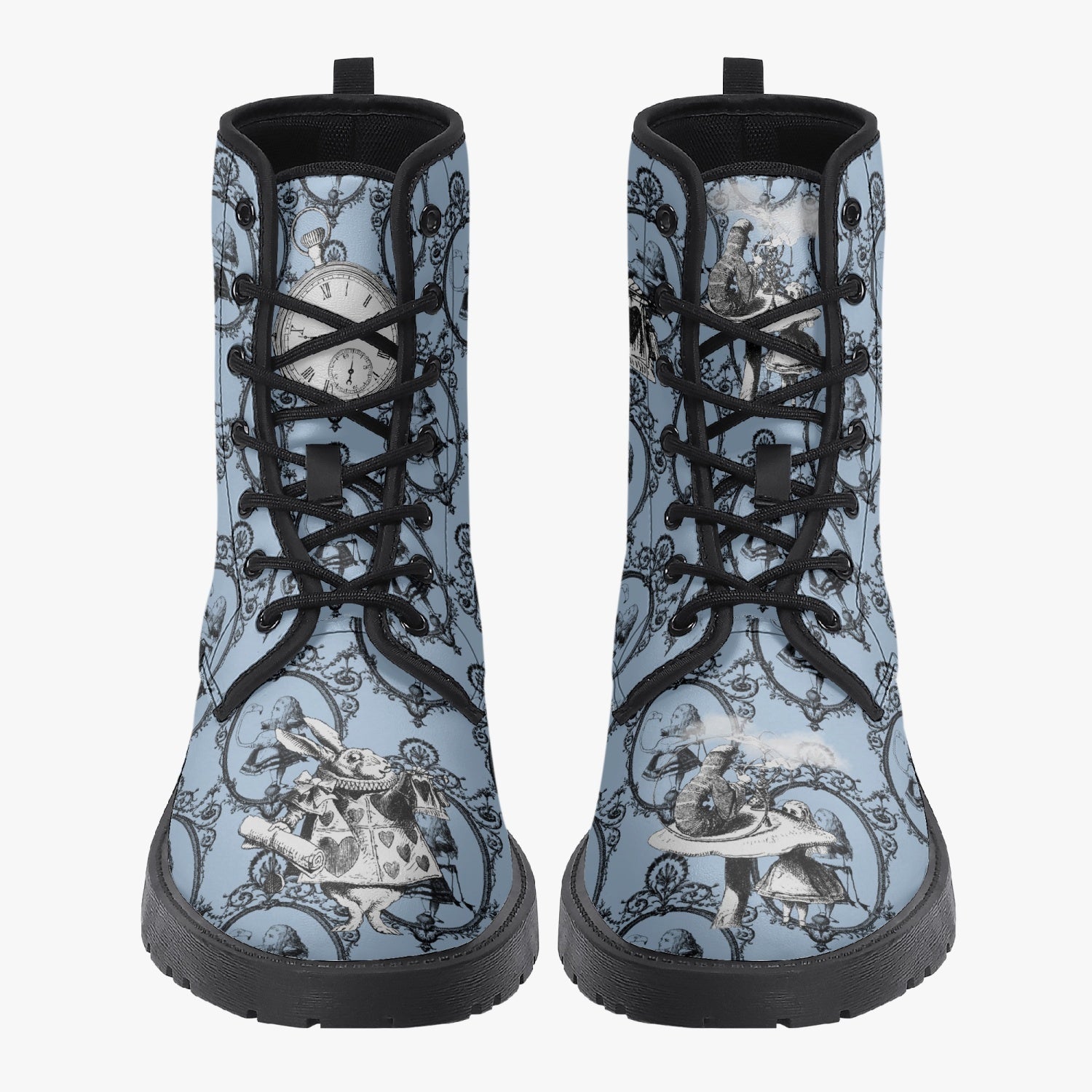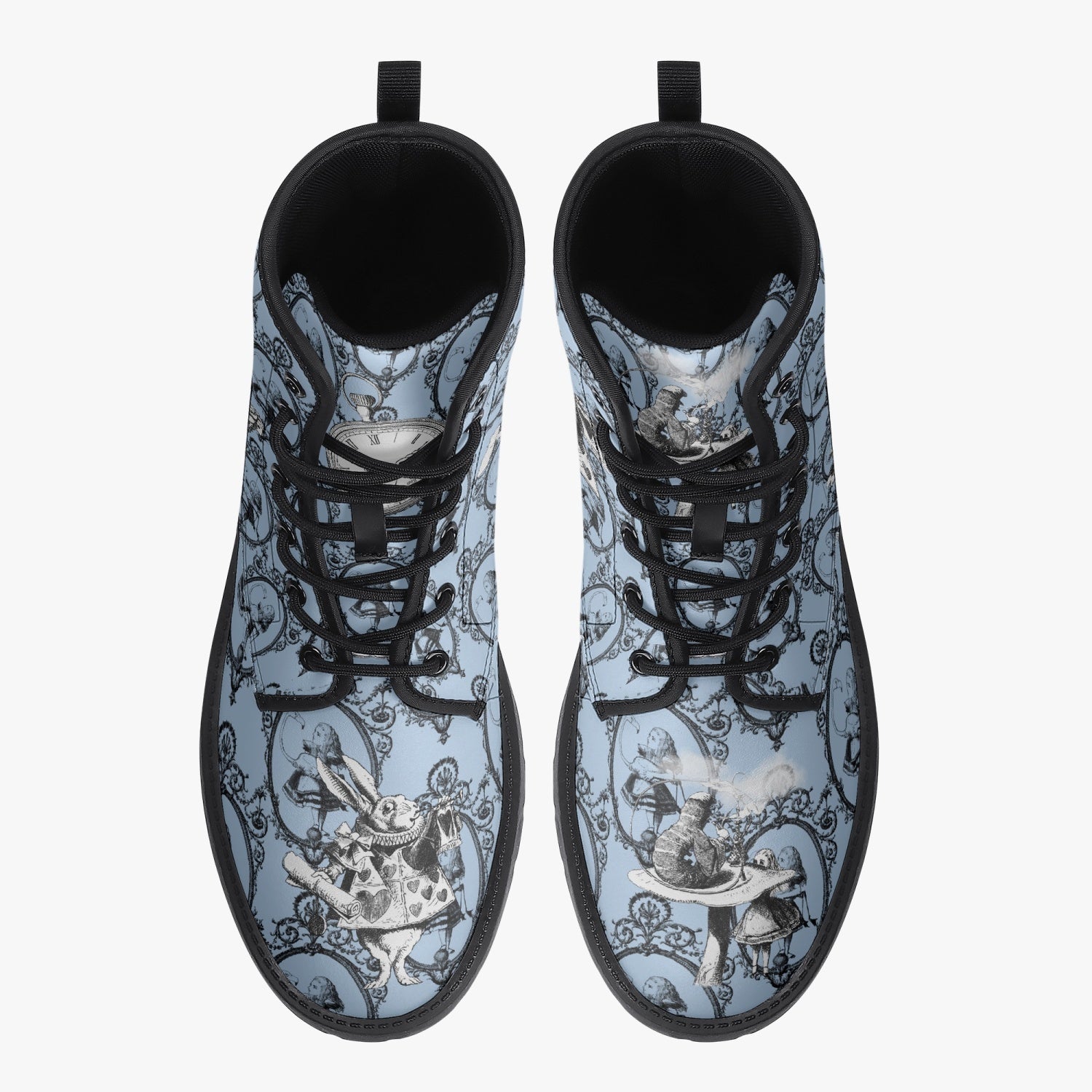 Alice in Wonderland Combat Boots in pastel blue featuring Alice, the White Rabbit, Mad Hatter, and the Caterpillar, the perfect footwear for those who want to add a touch of whimsy to their wardrobe.