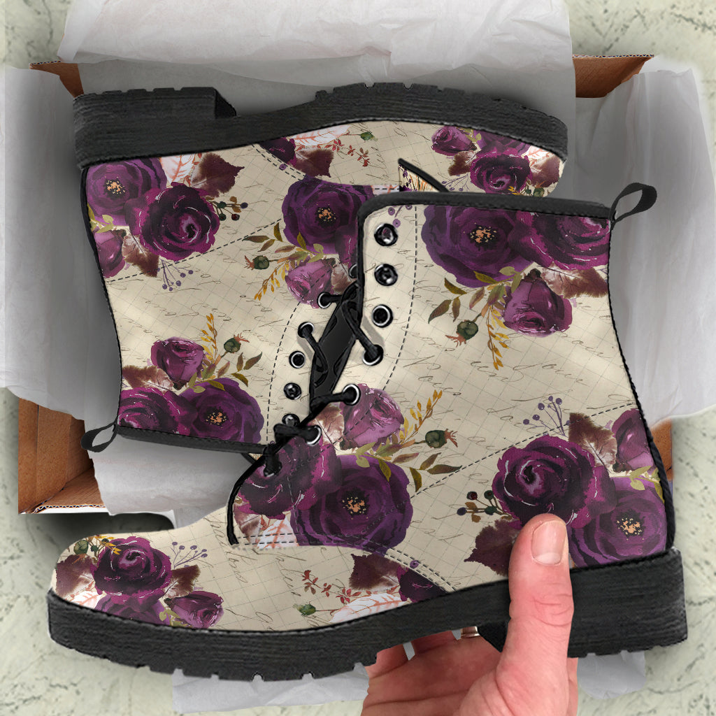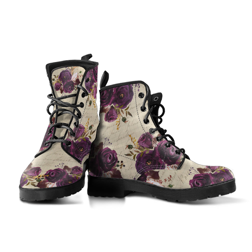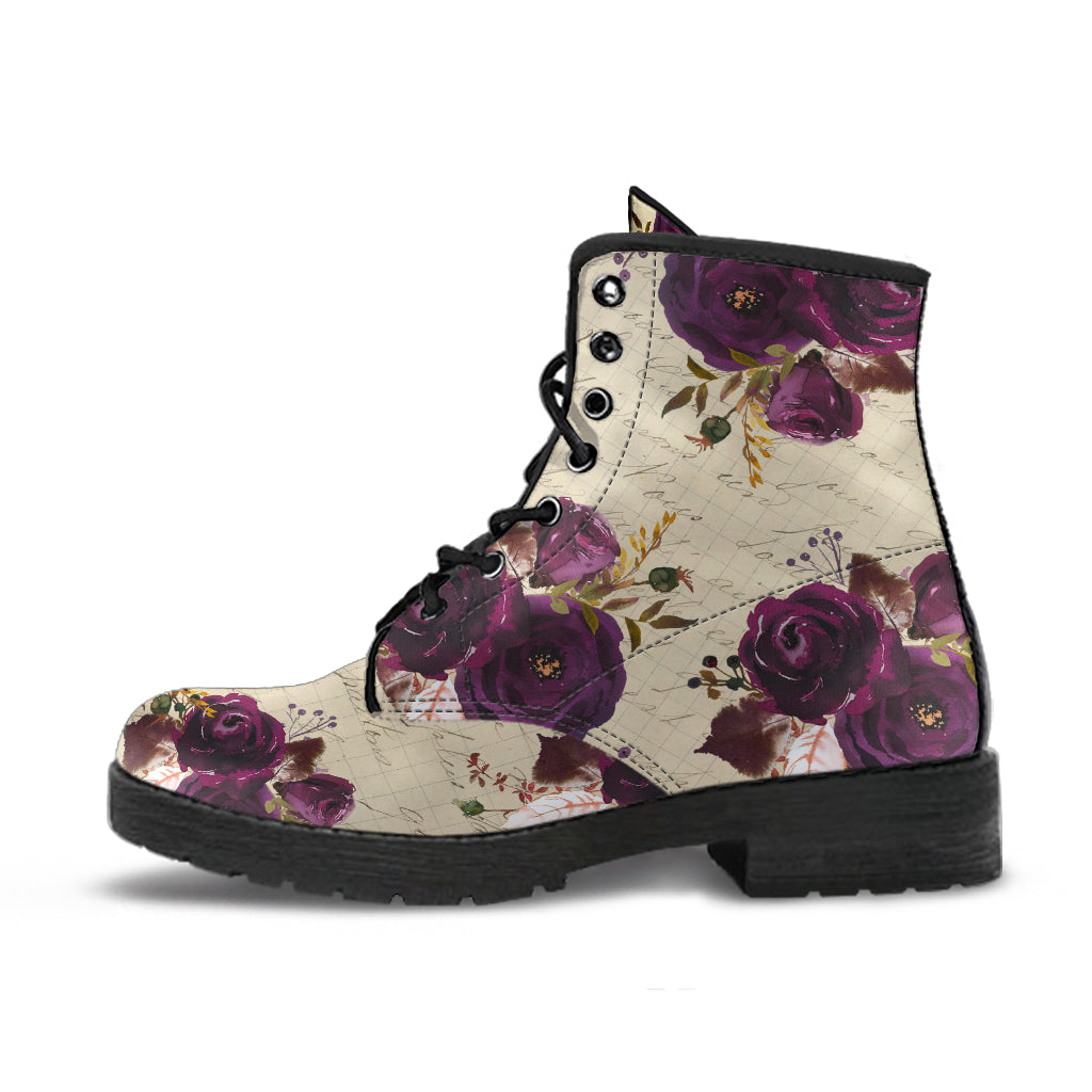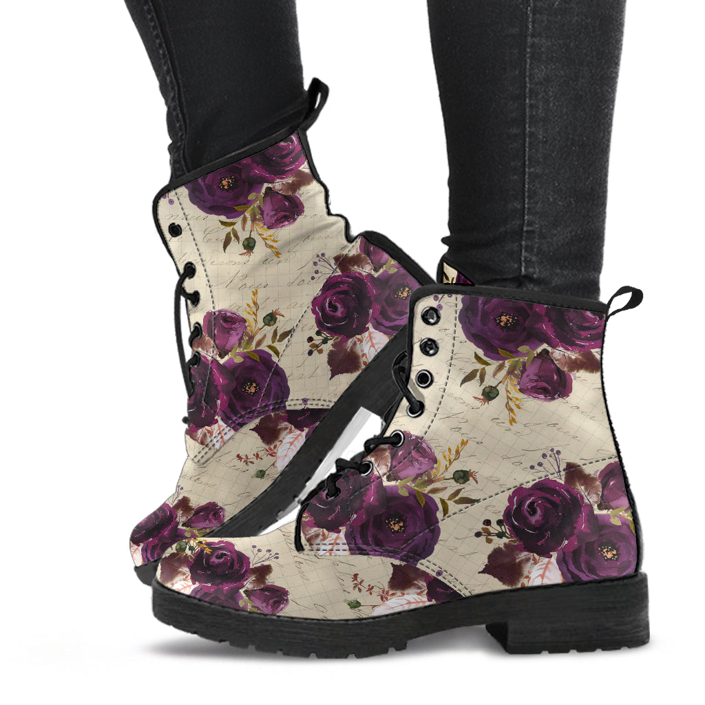 Beautiful burgundy roses floral print on a parchment background custom printed on Combat style lace up boots.