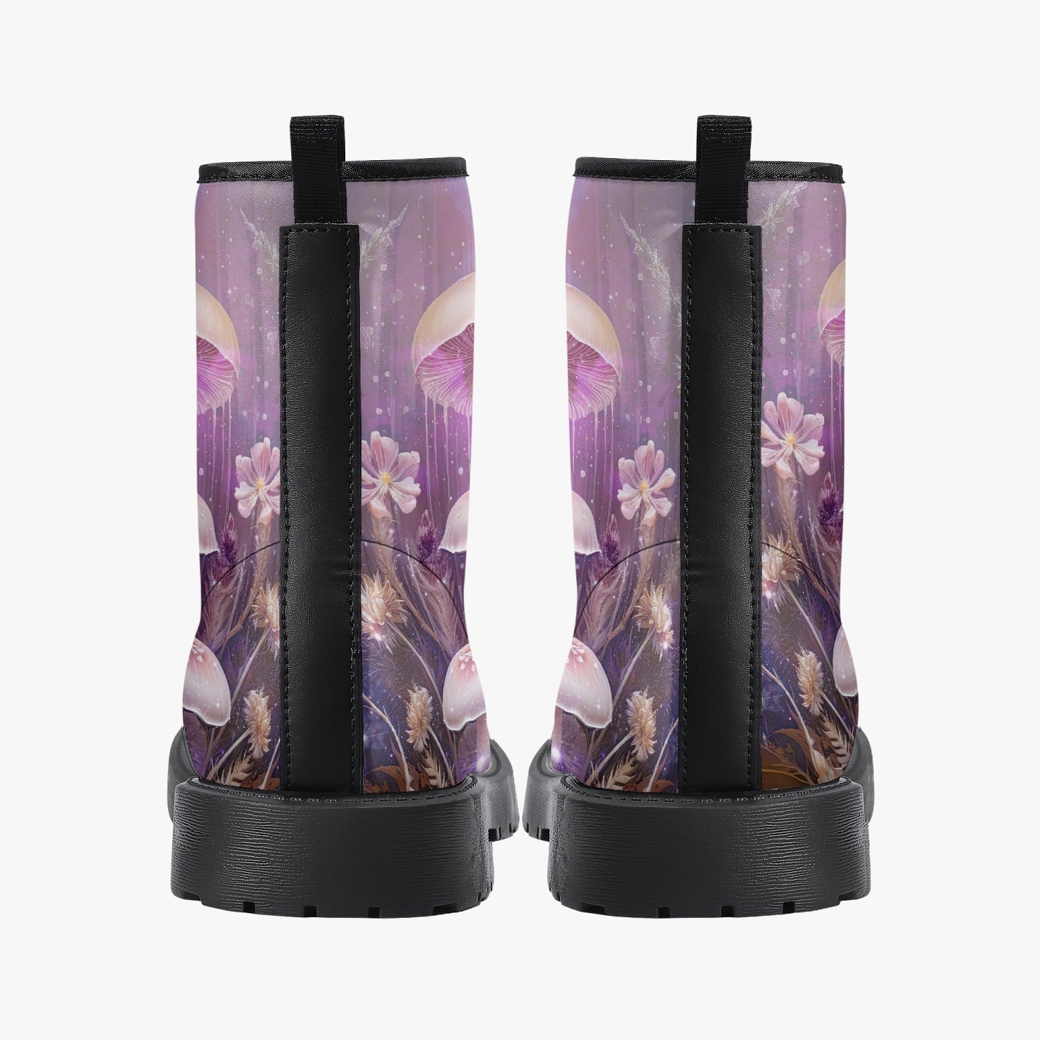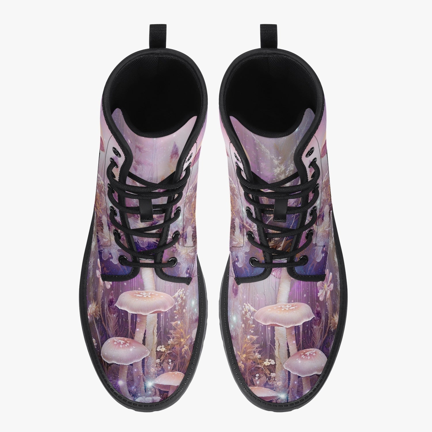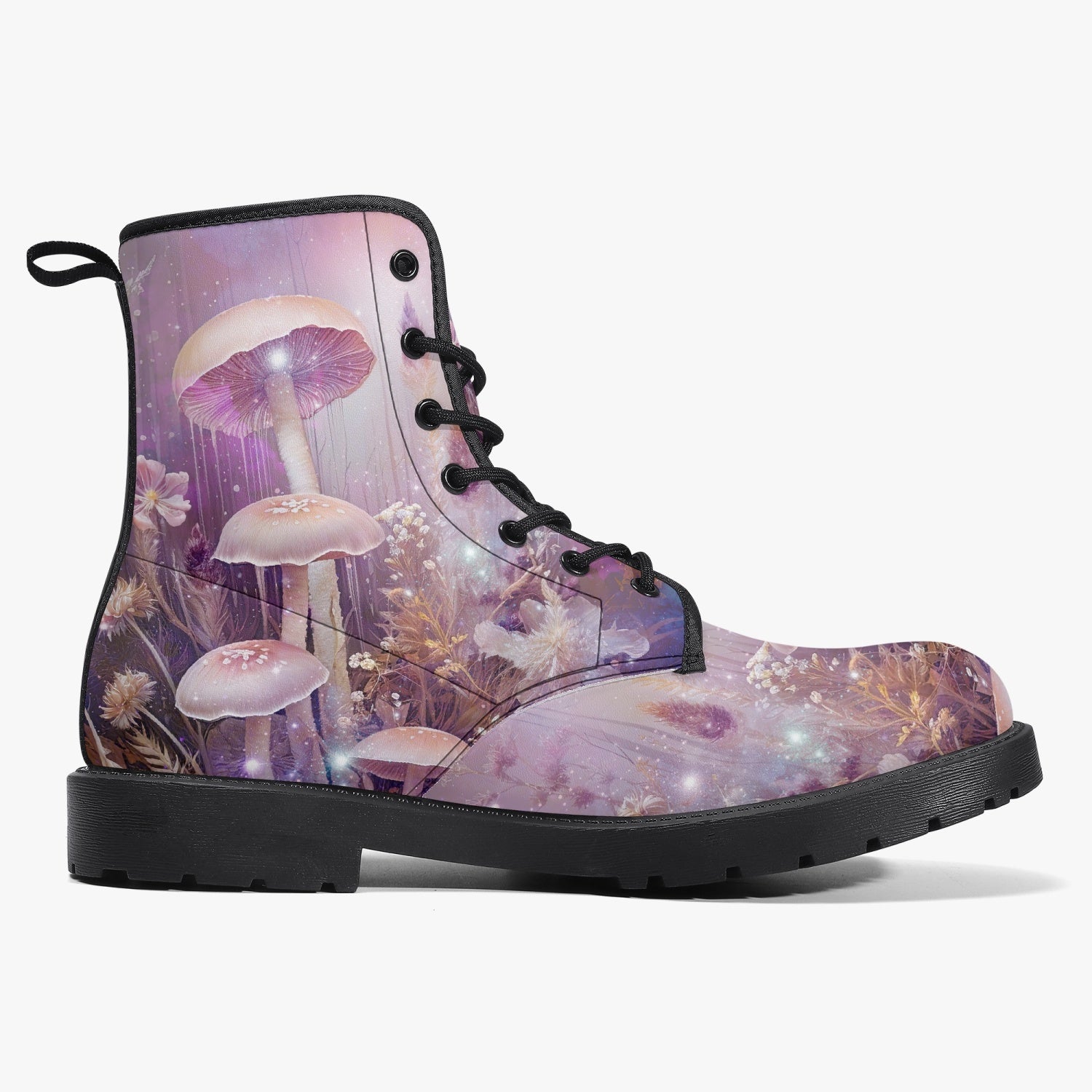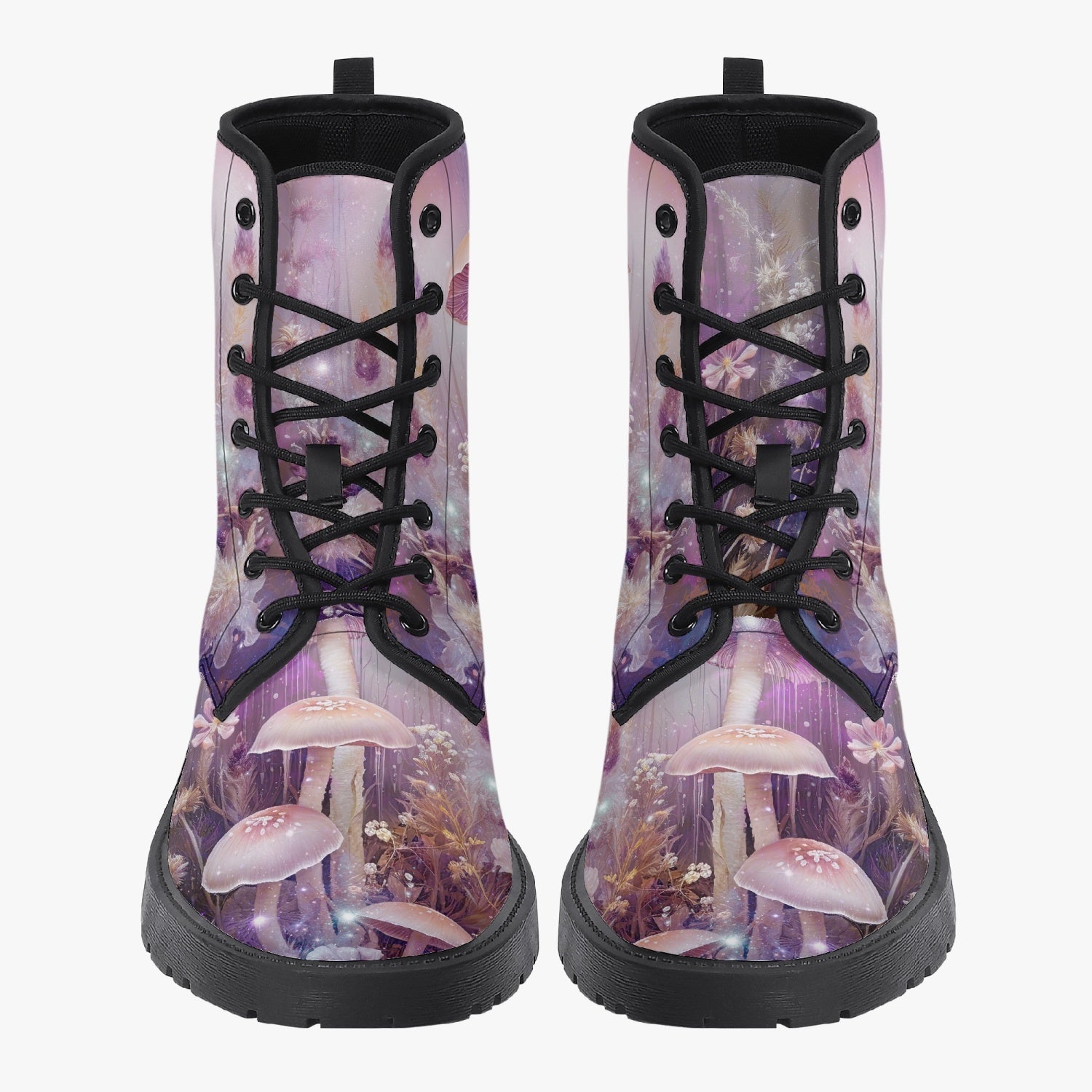For lovers of Fairy and Mushroom Core.  A heavenly dreamy Mushroom forest custom printed on high quality combat boots
