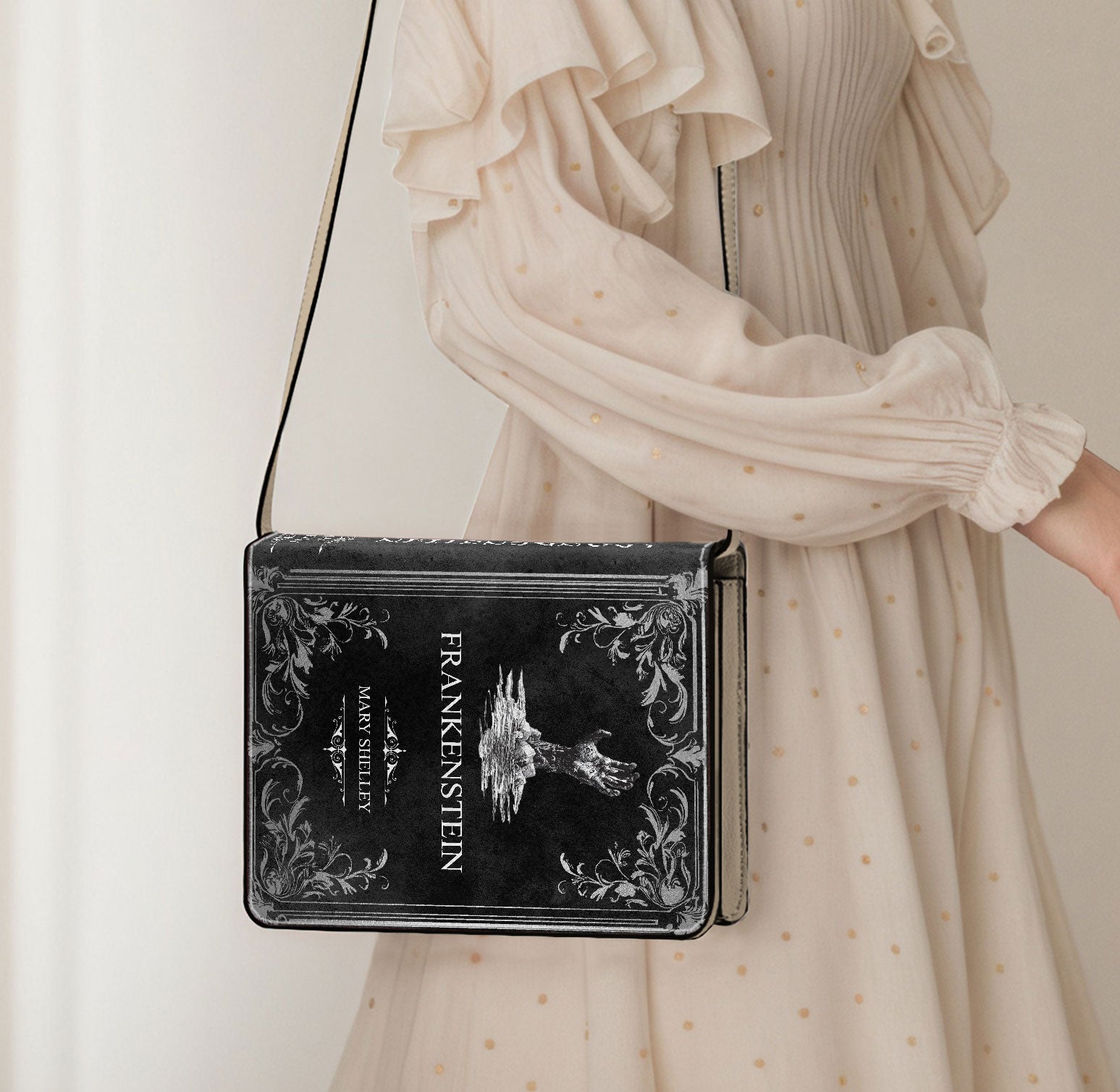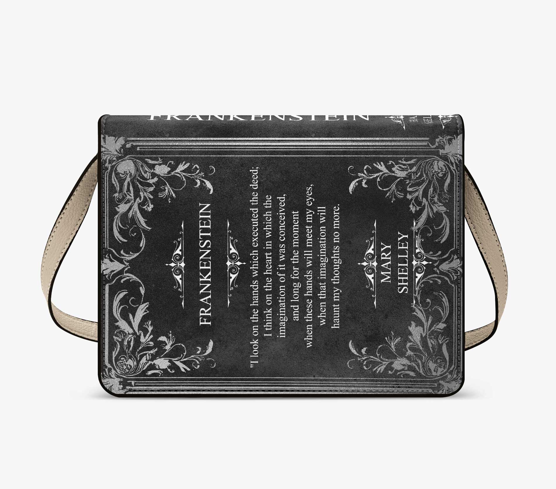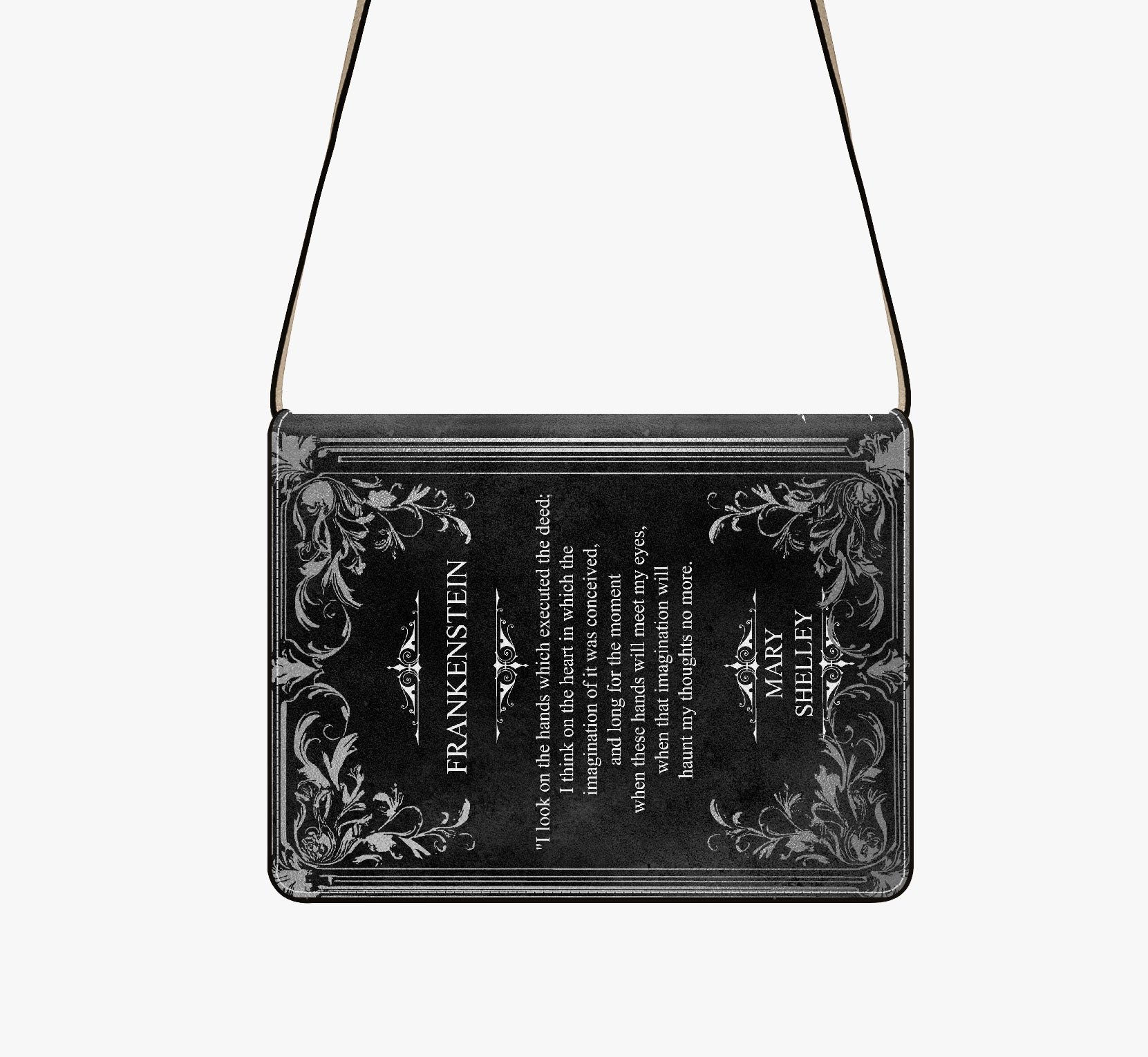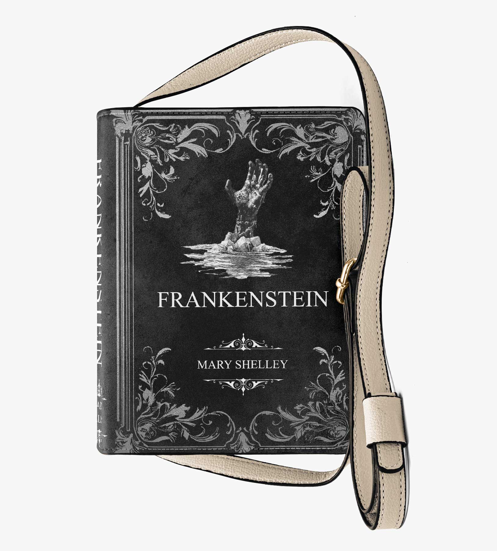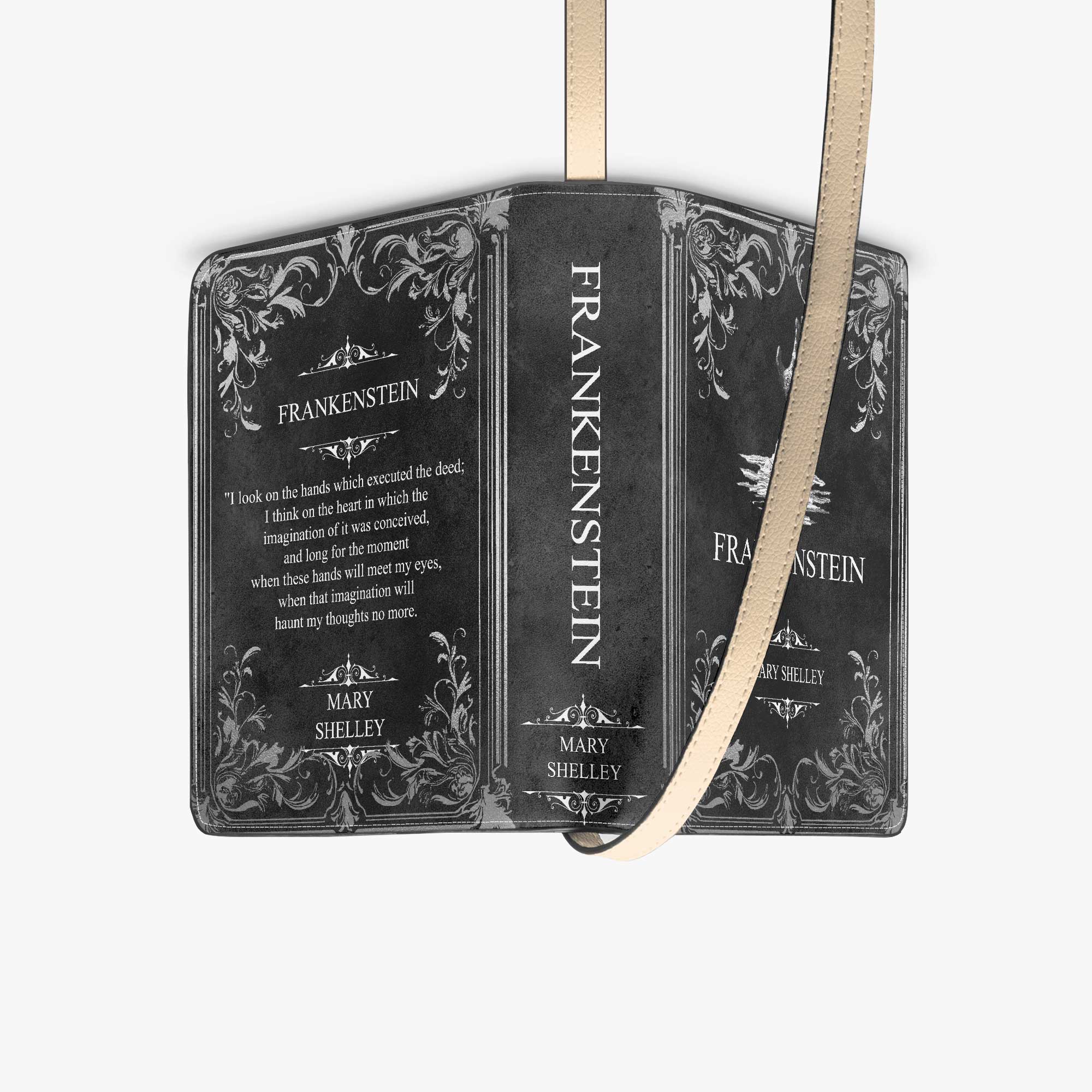 This gothic shoulder purse is custom printed to look like a hardcover edition of Mary Shelley’s Frankenstein, bringing a true classic of gothic horror into your everyday wardrobe. It’s a striking piece for readers who love dark literature and timeless storytelling.