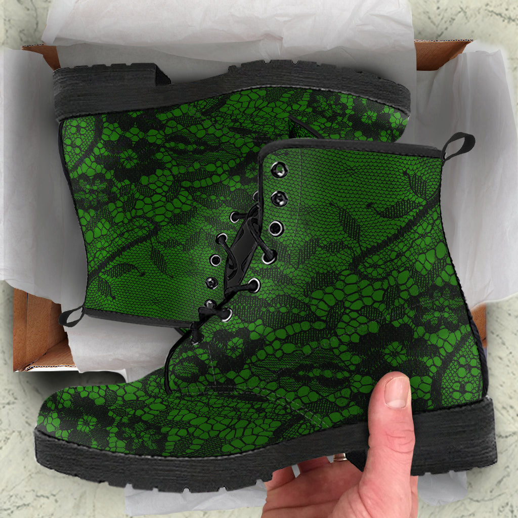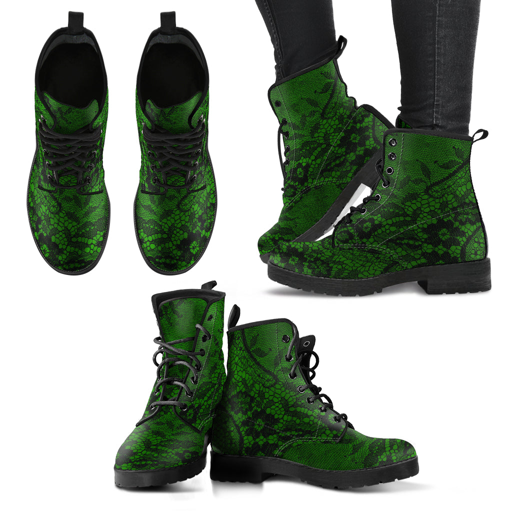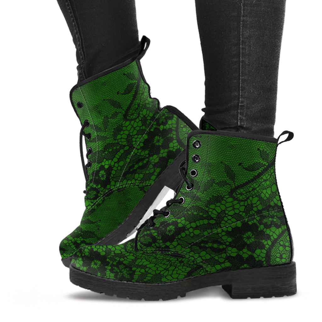 Style: Women's Leather Boots - Black - Gothic Green Lace Print Vegan Leather Combat Boots (REG82)