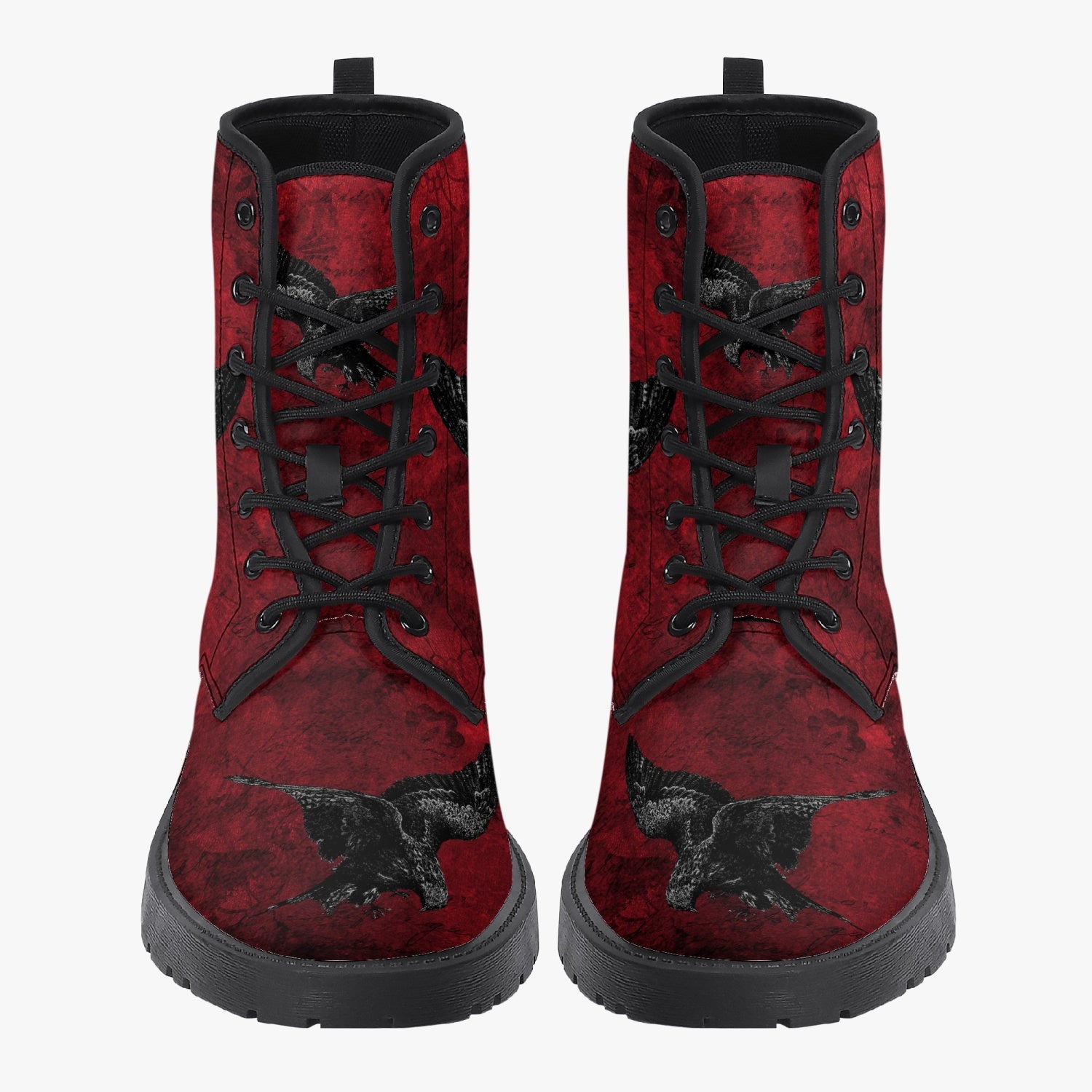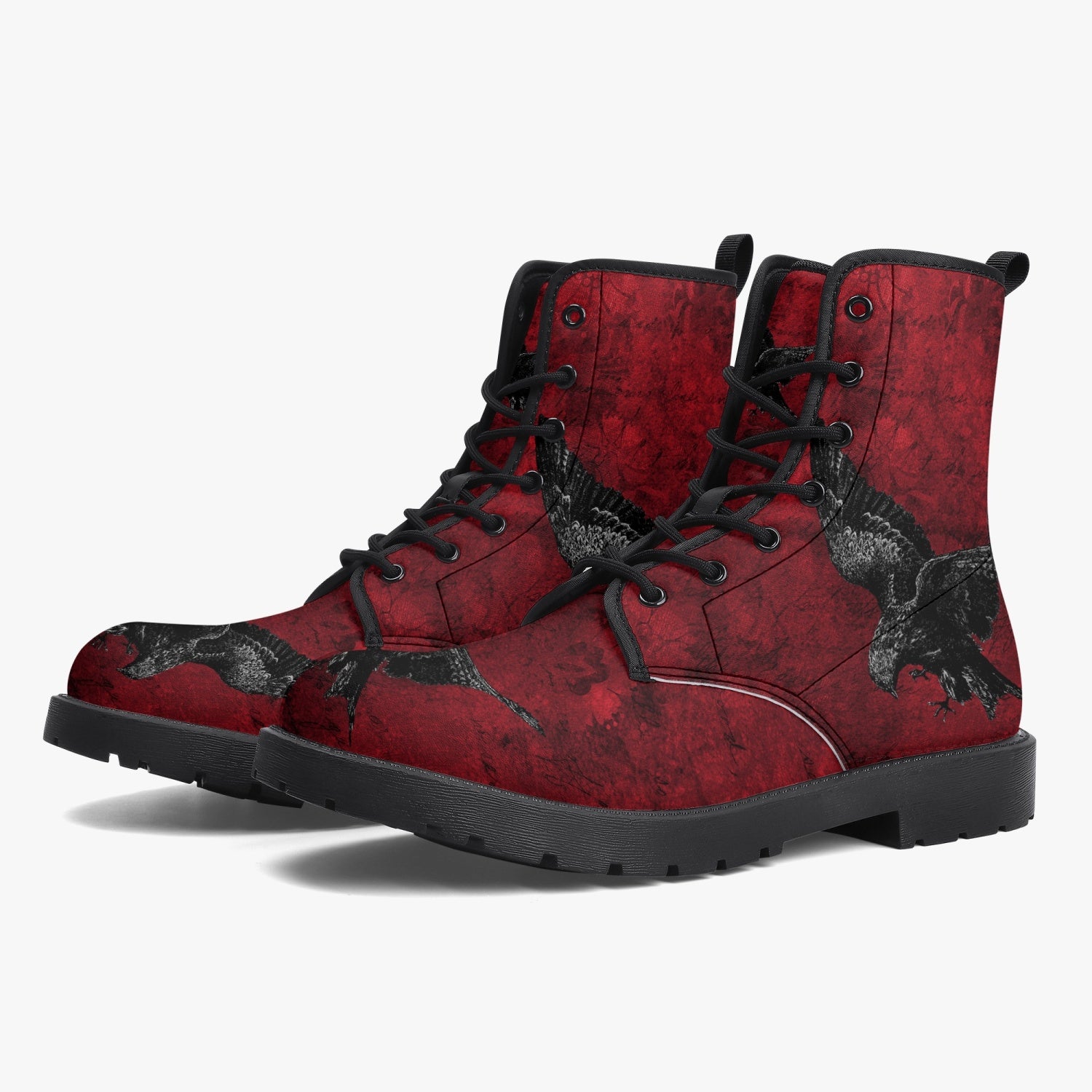 For lovers of all things Edgar Allan Poe, swooping Ravens printed on a blood red gothic grunge background custom printed on super comfortable lace up combat boots.
