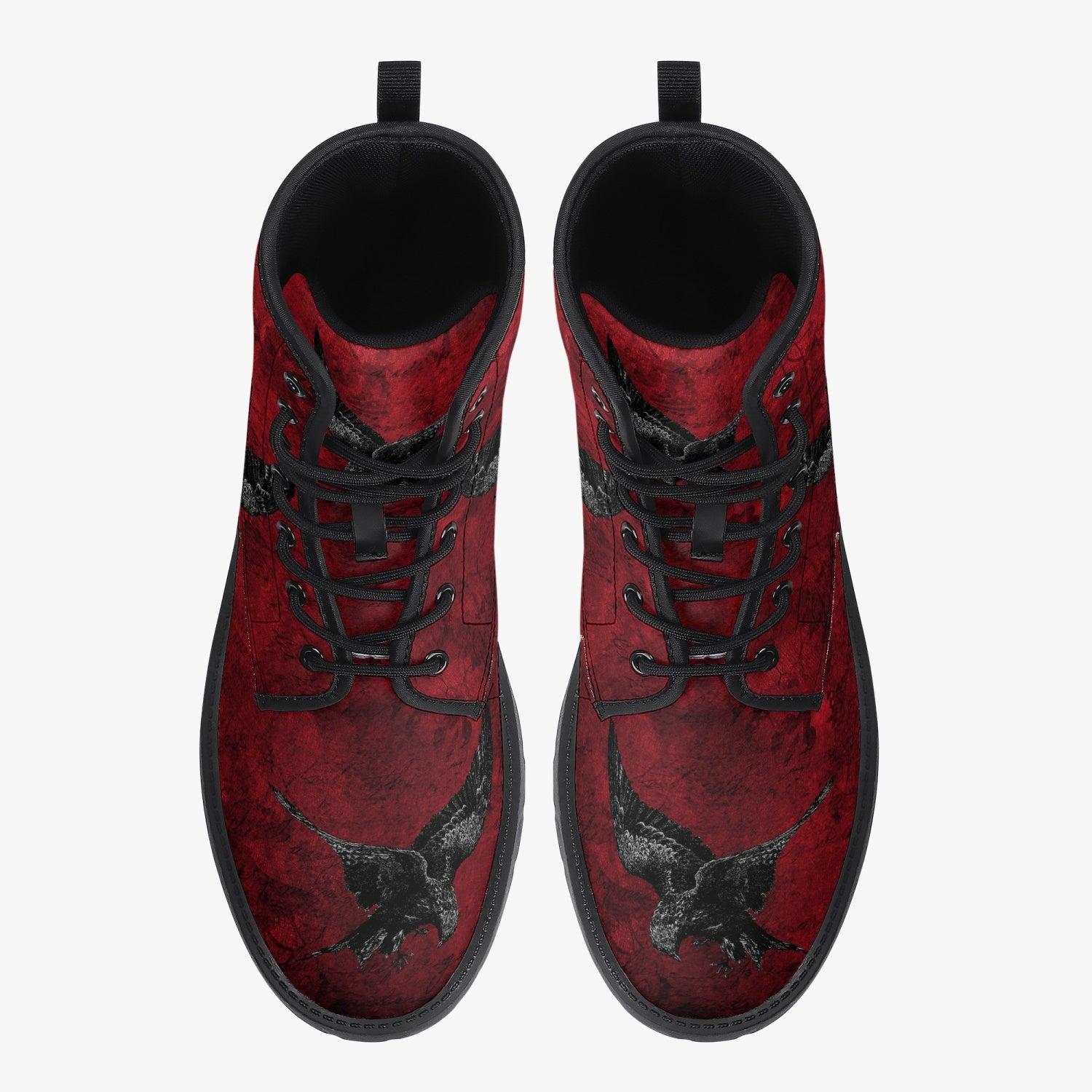 image shows blood red lace up combat boots, just above ankle length.  Boots feature a blood red grungy background with a swooping raven in black on the sides and toes.
