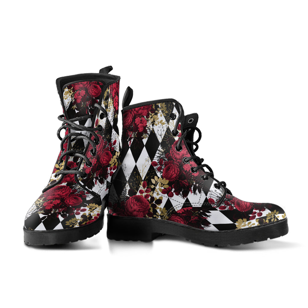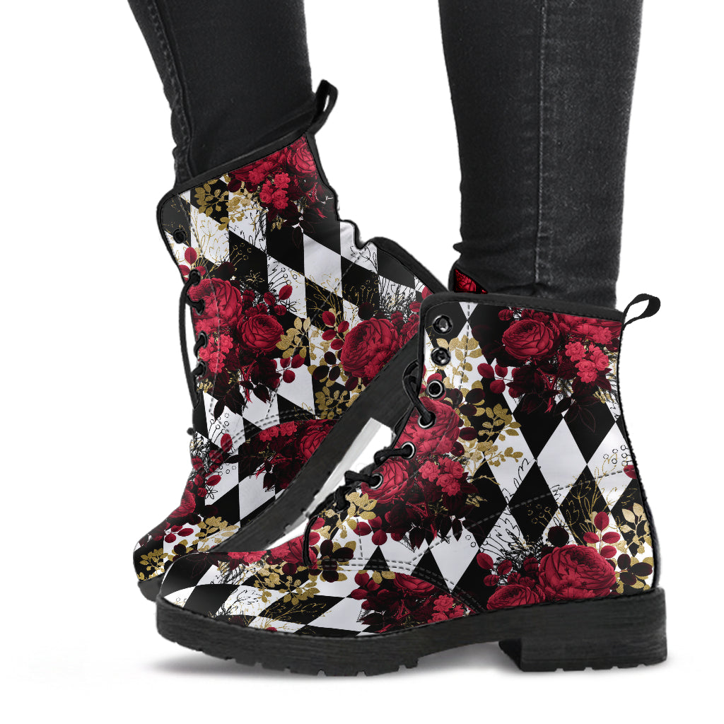 Gorgeous gothic Harlequin background lace up combat boots with red and gold roses.