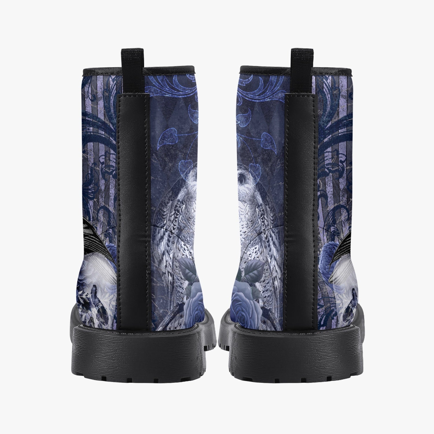 A Gothic Skull, Raven and Owl design printed on a super comfy combat boots. These make a great gift for lovers of Steampunk, Victorian and gothic imagery