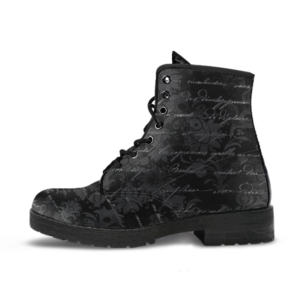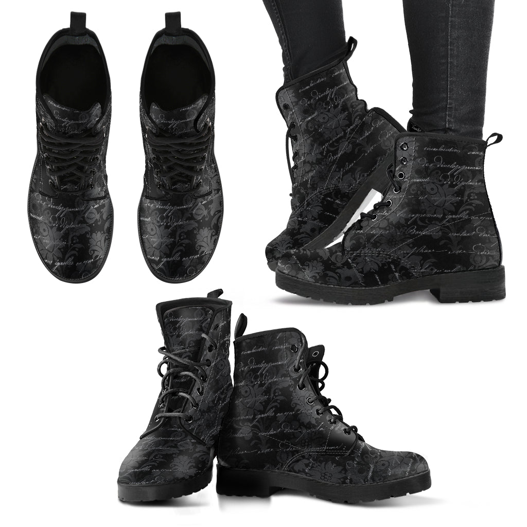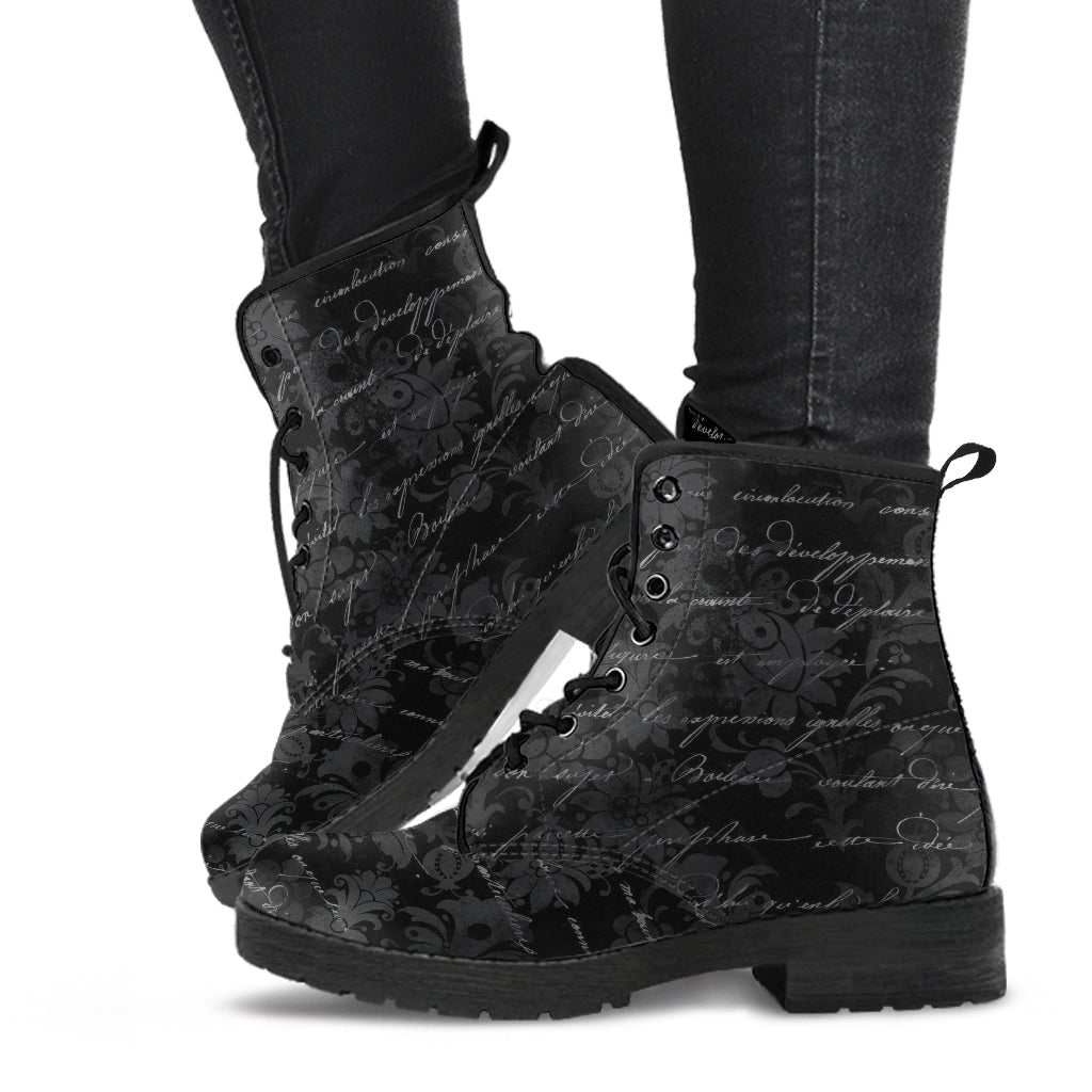 Gorgeous gothic combat boots custom printed with vintage writing on a black damask background