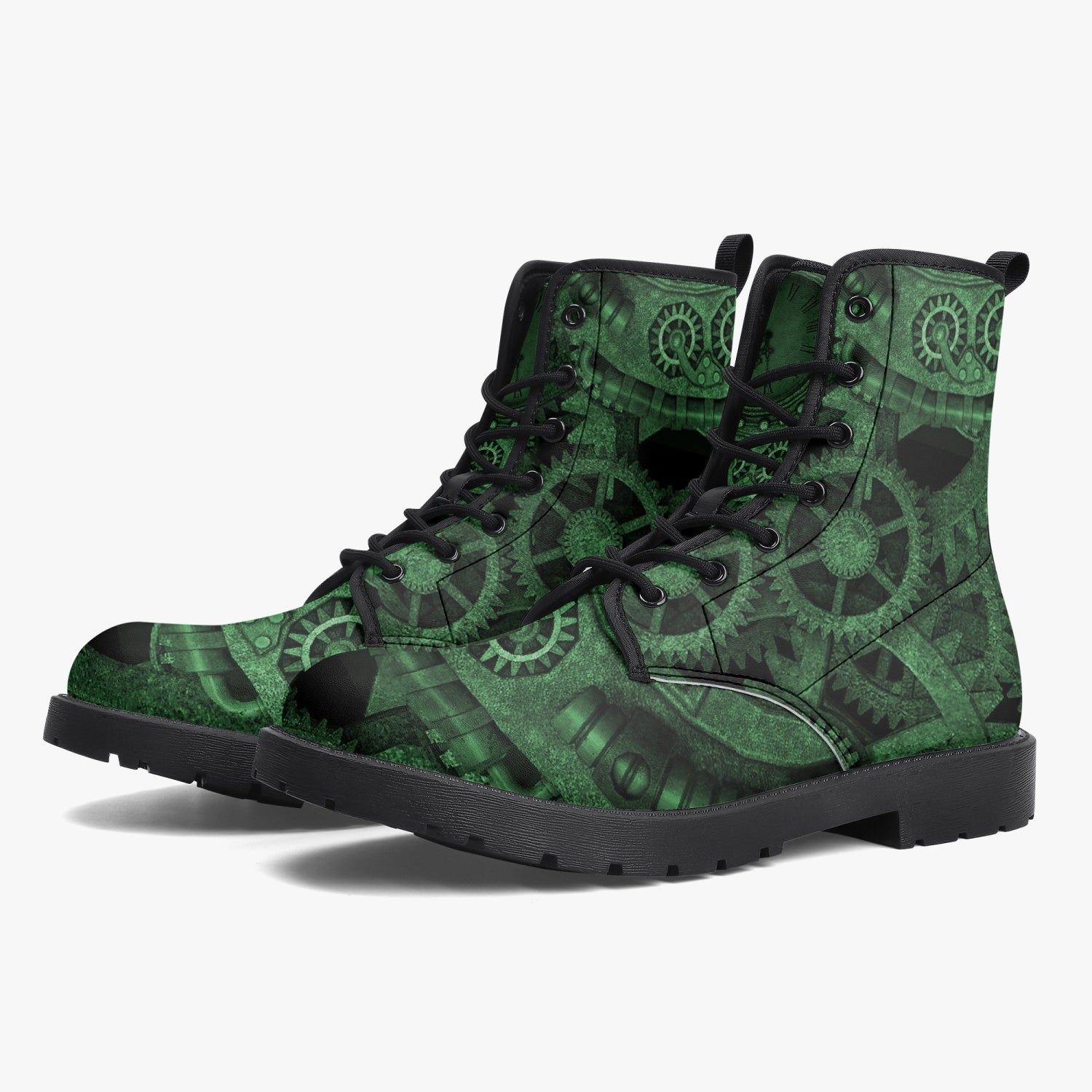 Deep green clockwork gear design in deep green tones custom printed on a Vegan friendly faux Leather Combat boots.