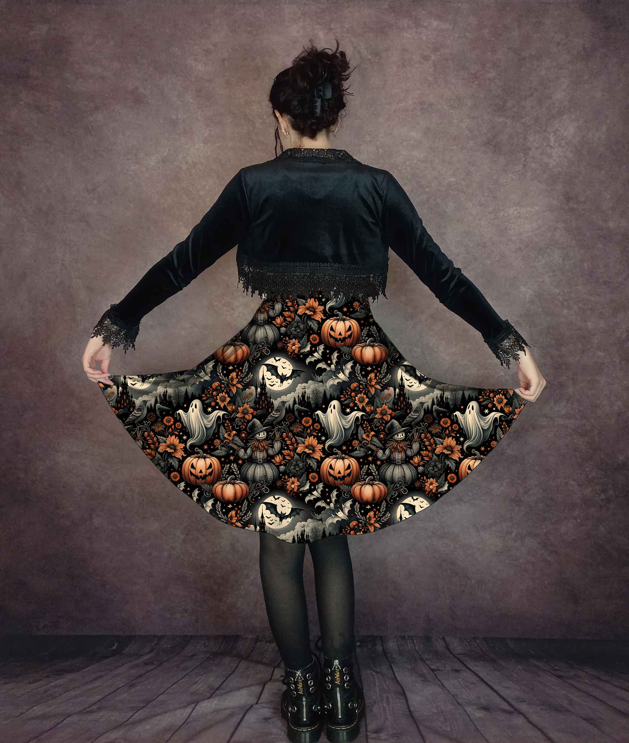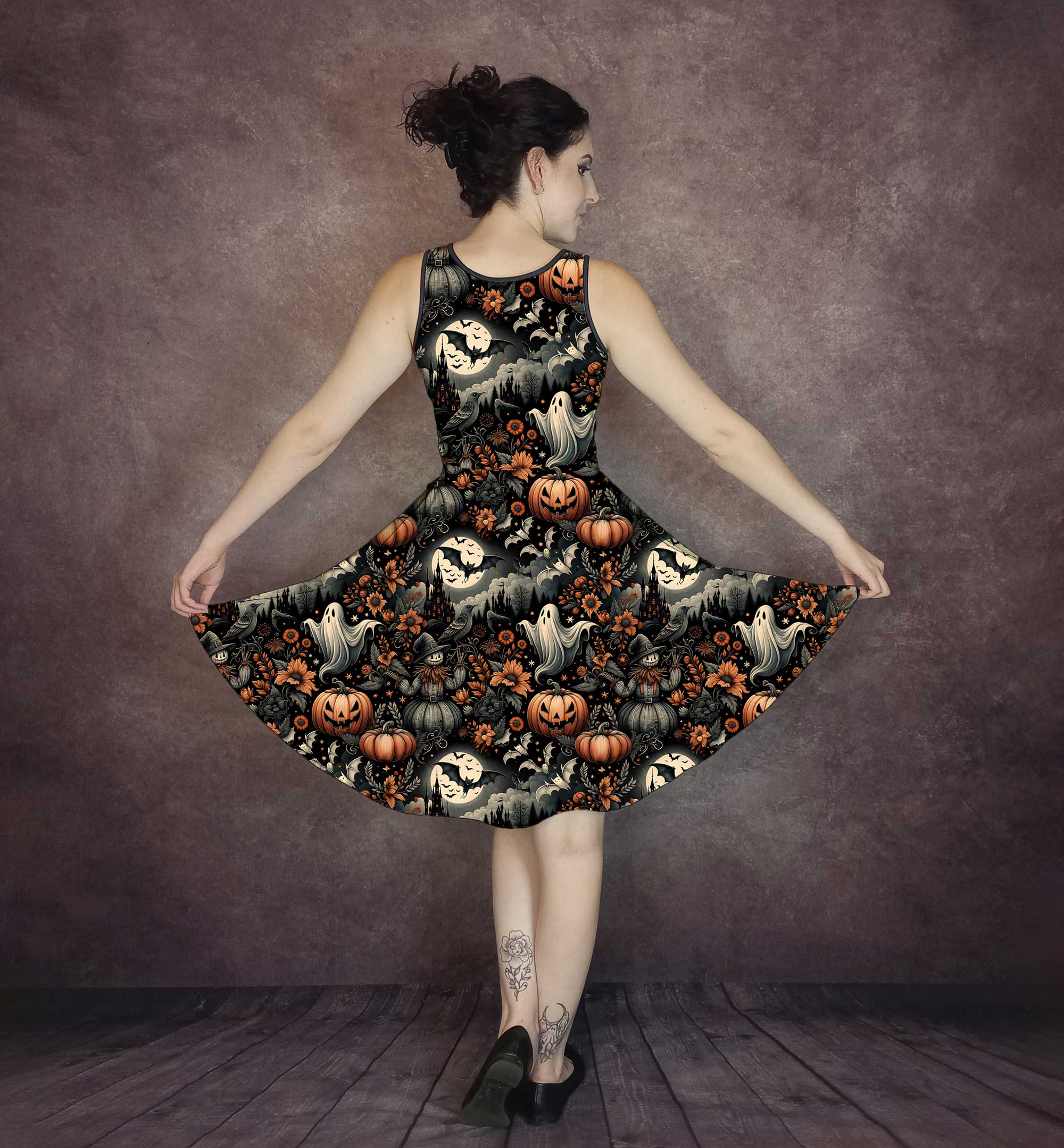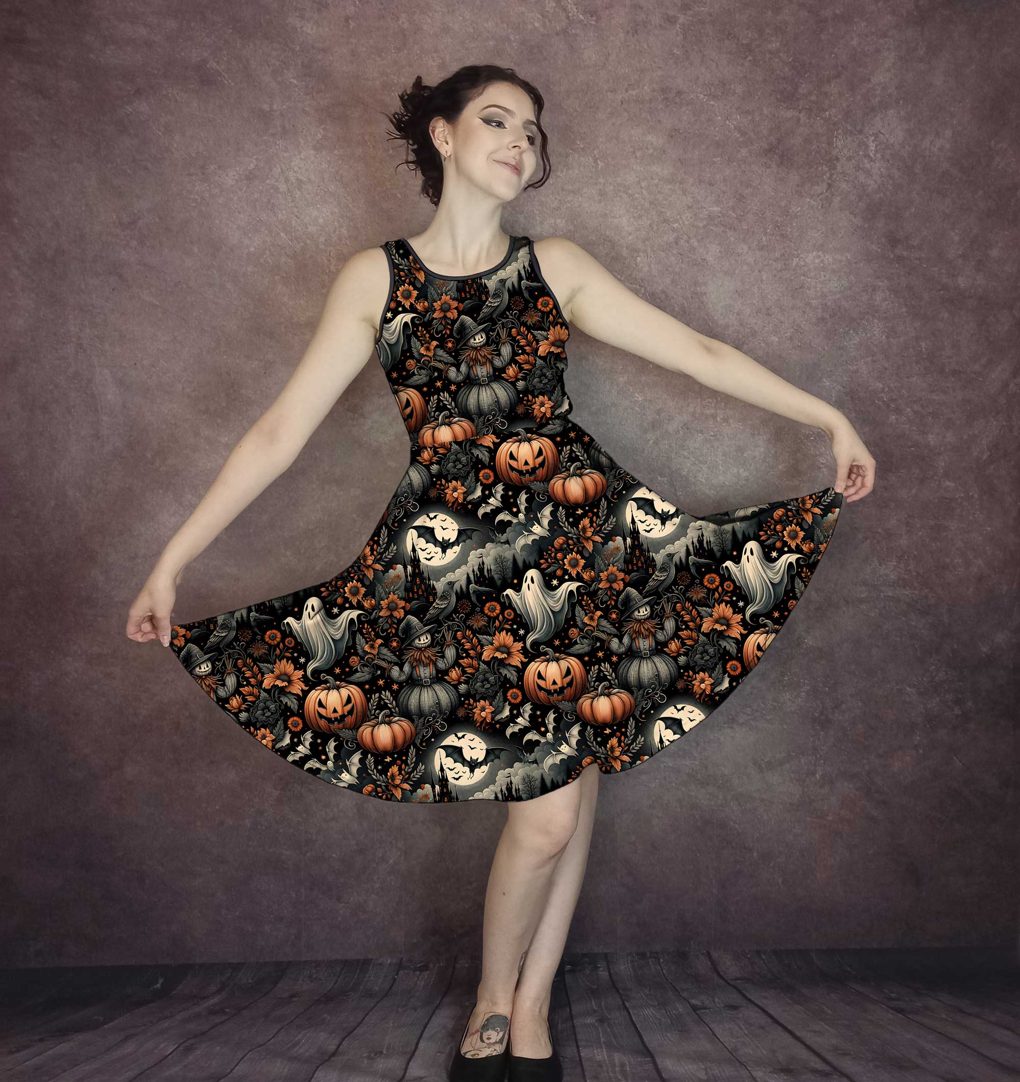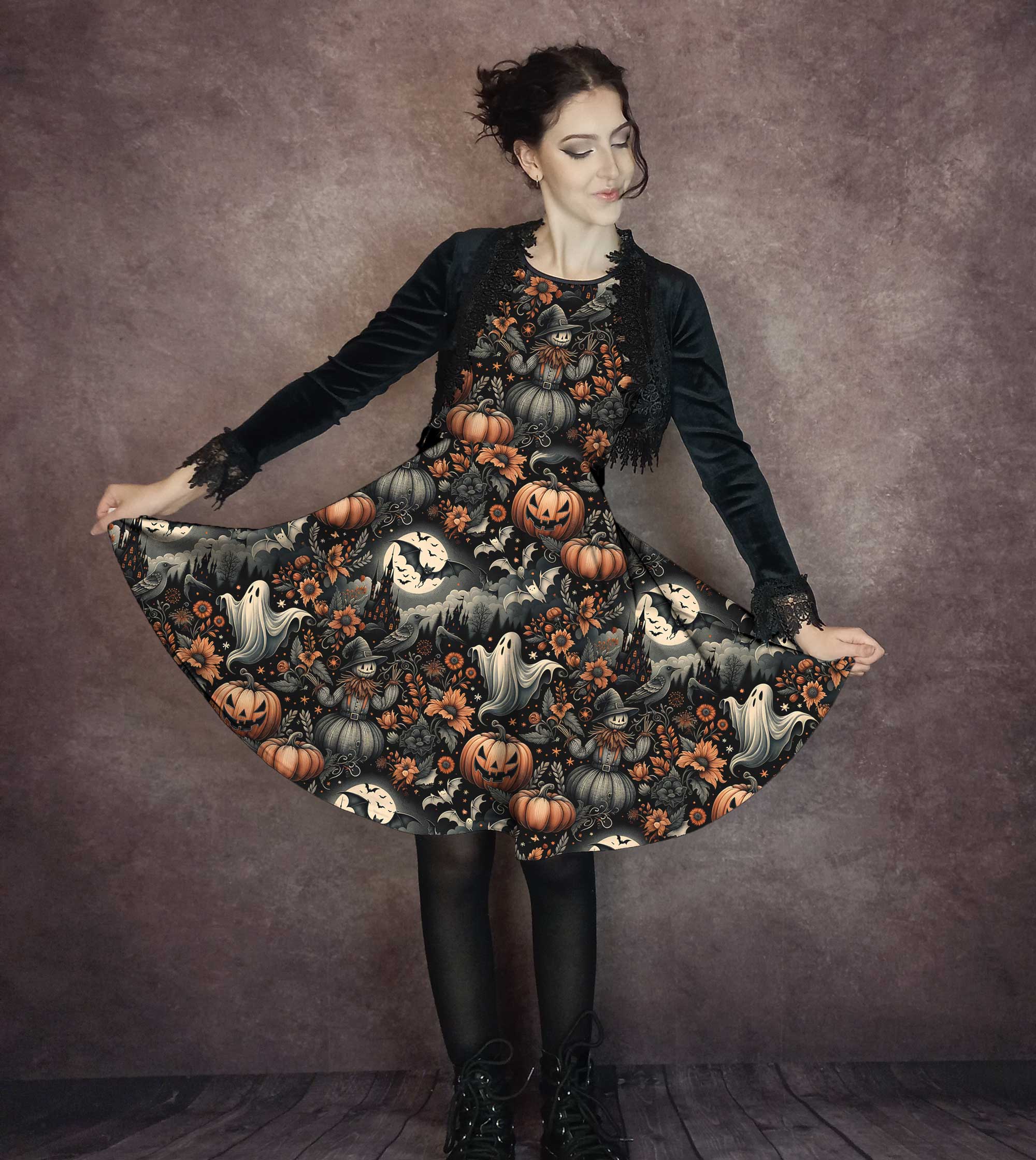 A fun Halloween dress.  You'll find pumpkins and gravestones, ghosts, bats and more on this epic spooky season dress.