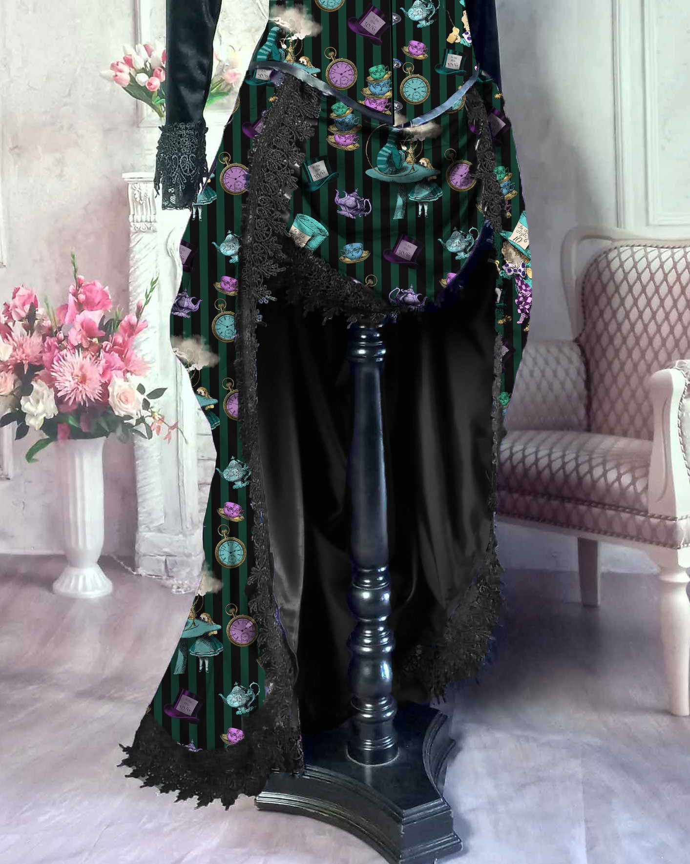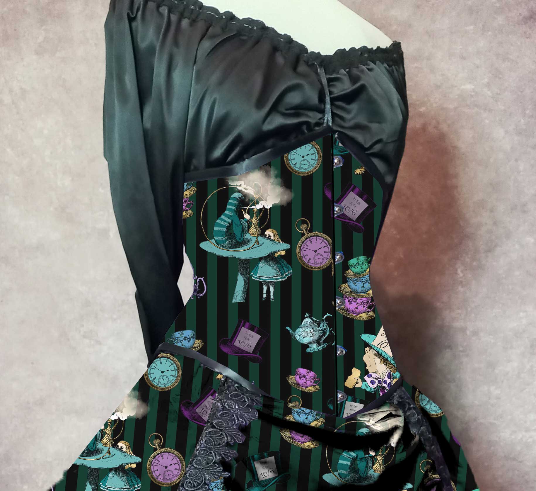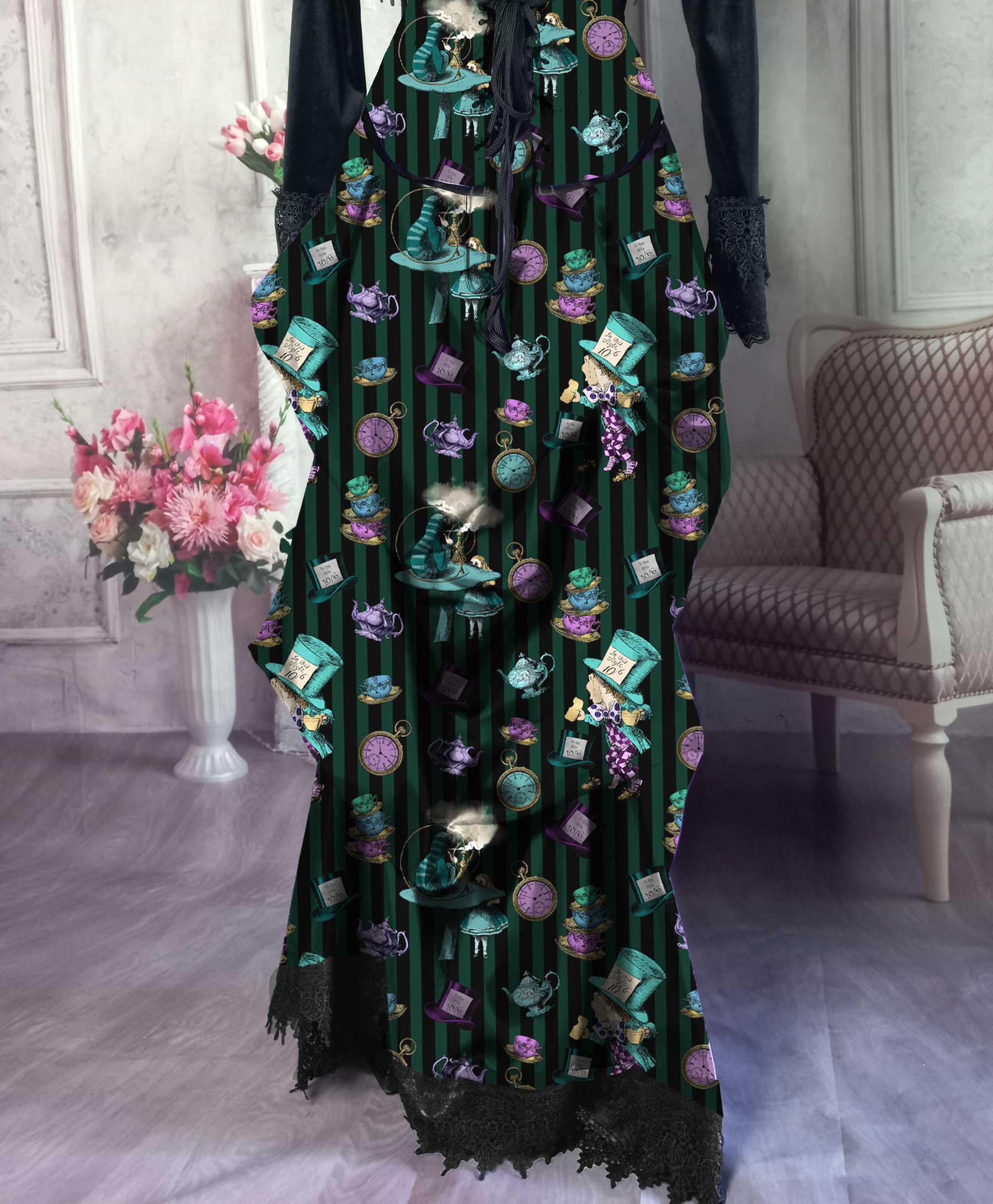 Delightful green and black striped Alice in Wonderland Victorian bustle Ensemble. So much fun to wear. You'll find the The Mad Hatter surrounded by Top Hats, Teapots, Teacups and pocket watches custom printed on this hi lo bustle skirt. Just perfect for Mad Hatter Tea Parties and other Alice in Wonderland events.