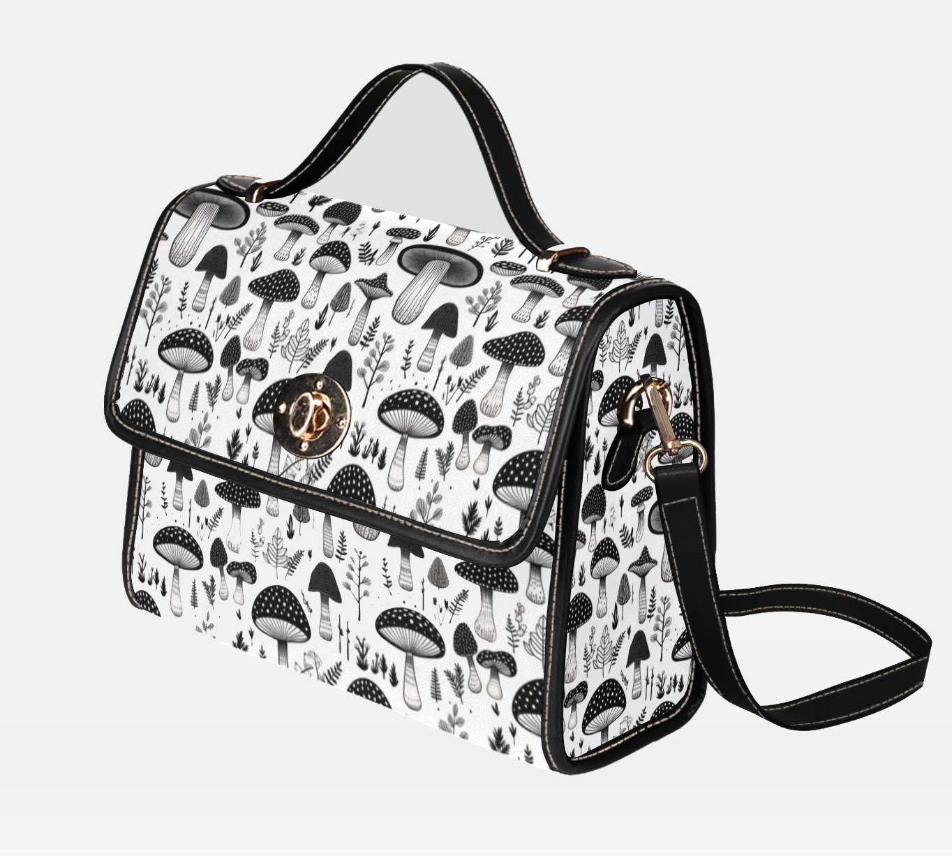 For Mushroomcore addicts - This fun shoulder satchel will make your day.  Featuring a delightful collection of mushrooms custom printed in classic black and white.