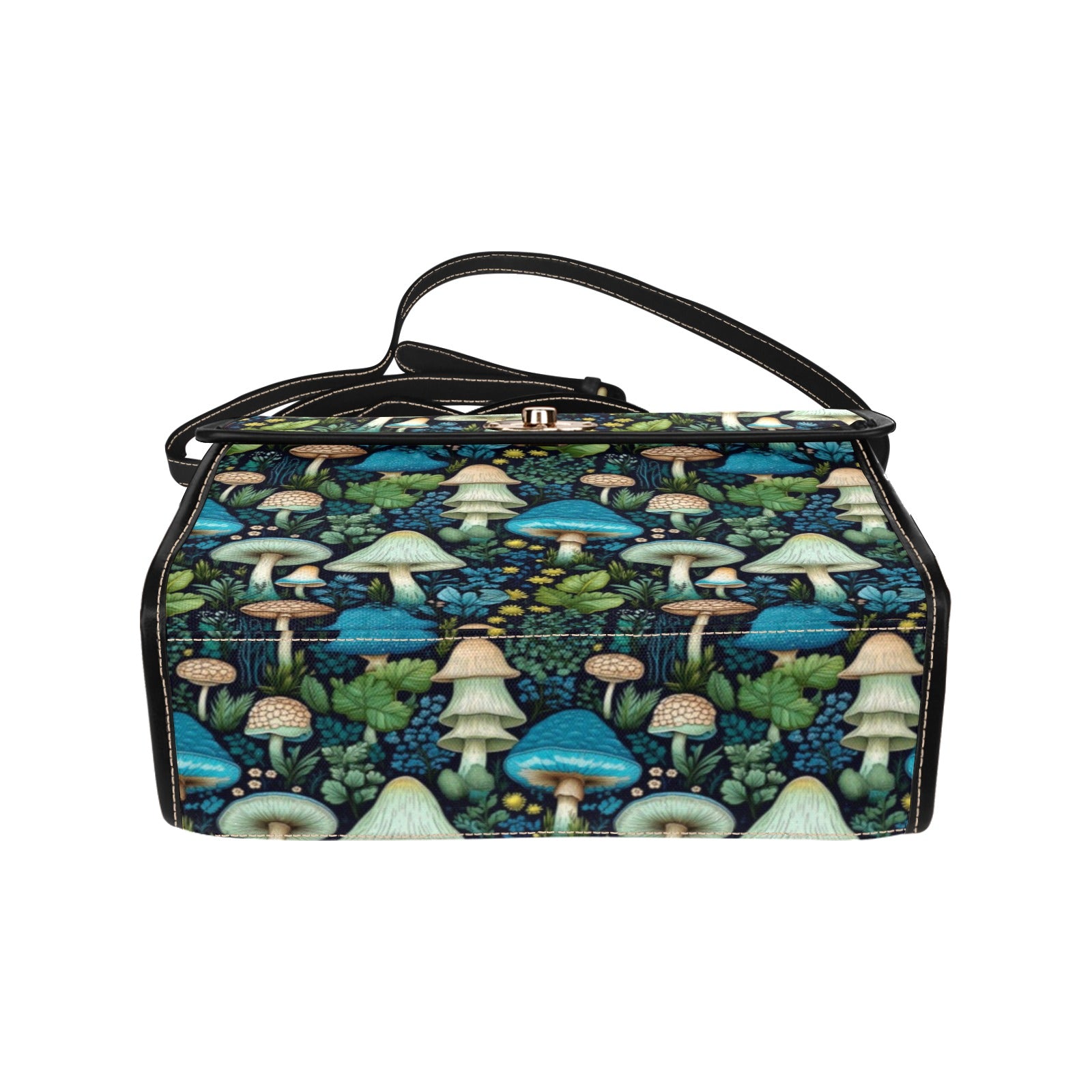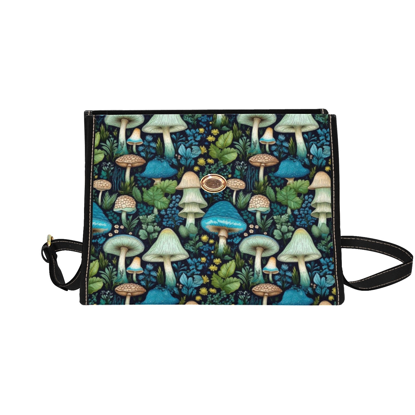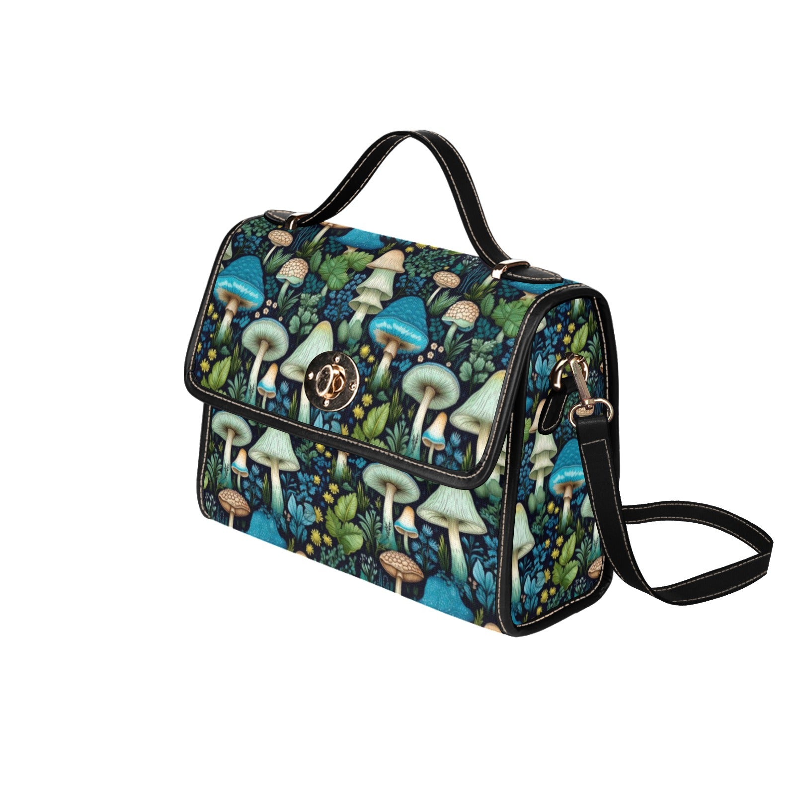 For Mushroomcore addicts - This fun shoulder satchel will make your day.  Featuring a delightful collection of mushrooms custom printed in blues and greens.