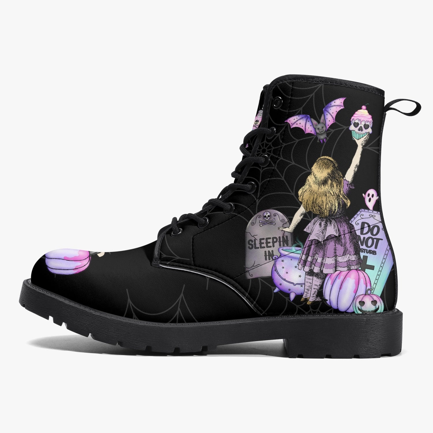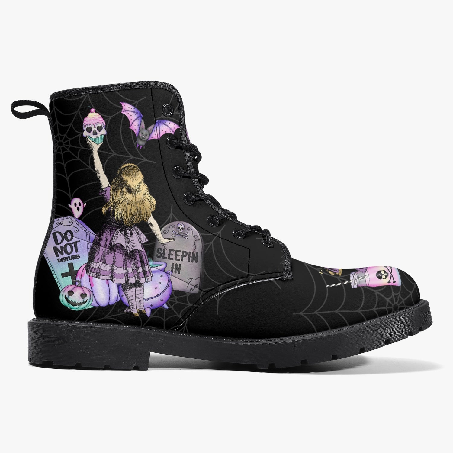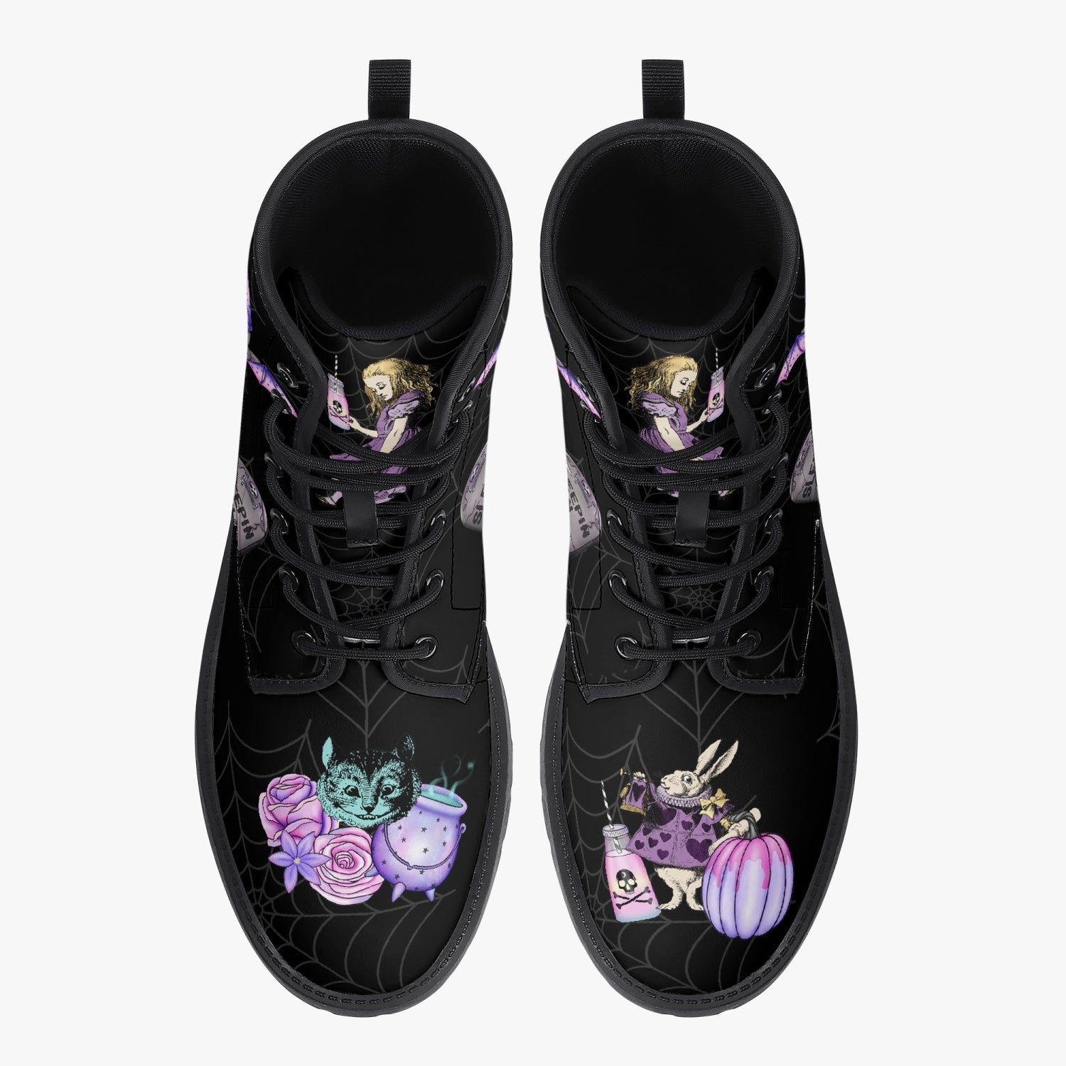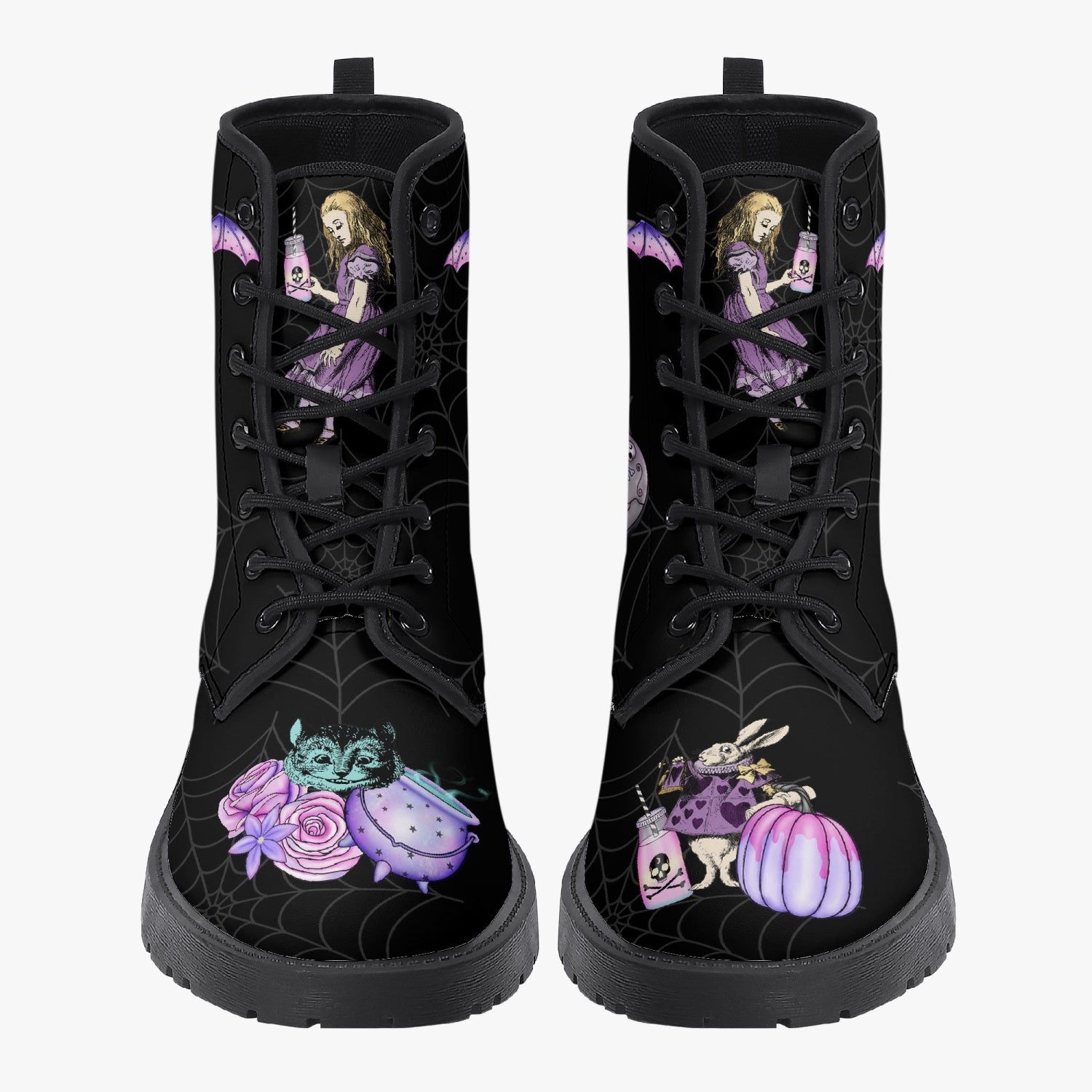 Pastel Goth Alice in Wonderland. Awesome combat boots which are super comfortable. This fun gothic Alice design showcases Alice surrounded by pastel goth imagery. Cauldrons, bats, ghosts, coffins, gravestones, you'll find the White Rabbit and Cheshire Cat in there too.
