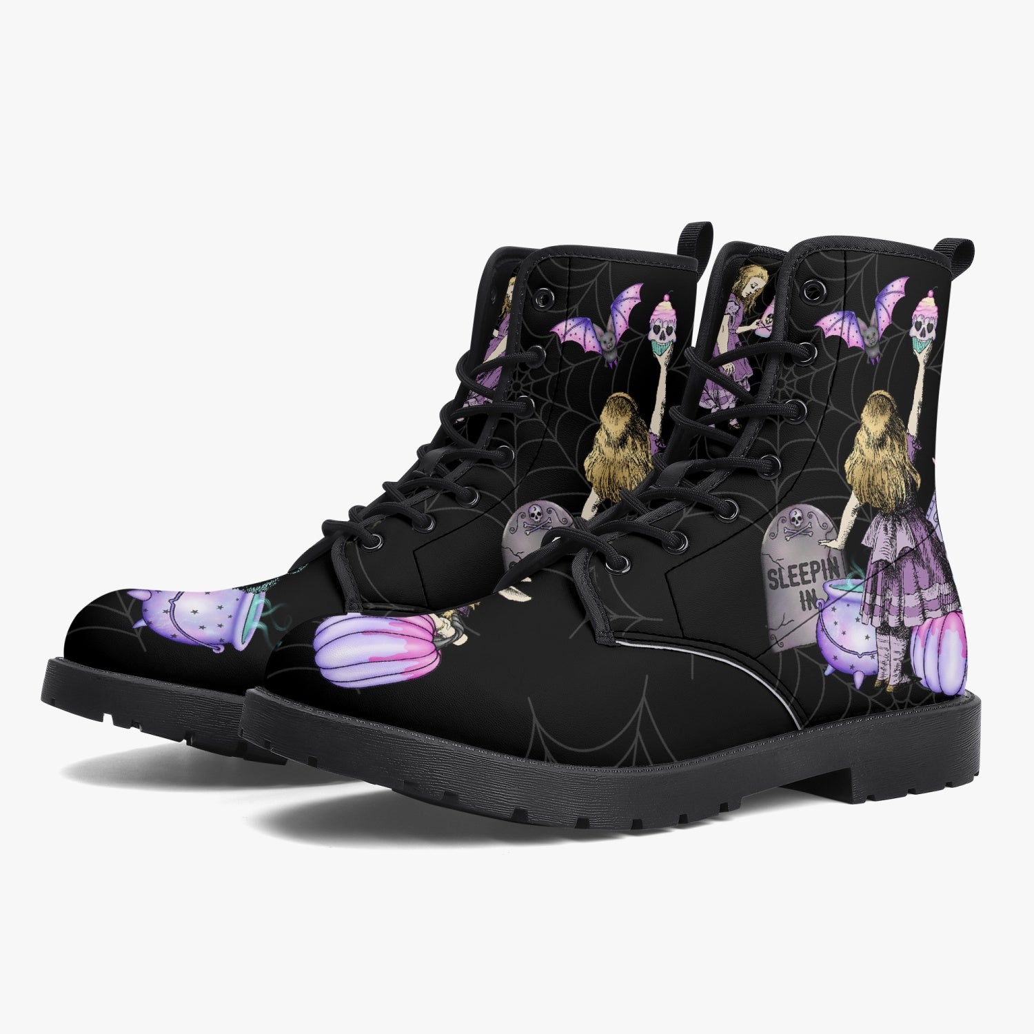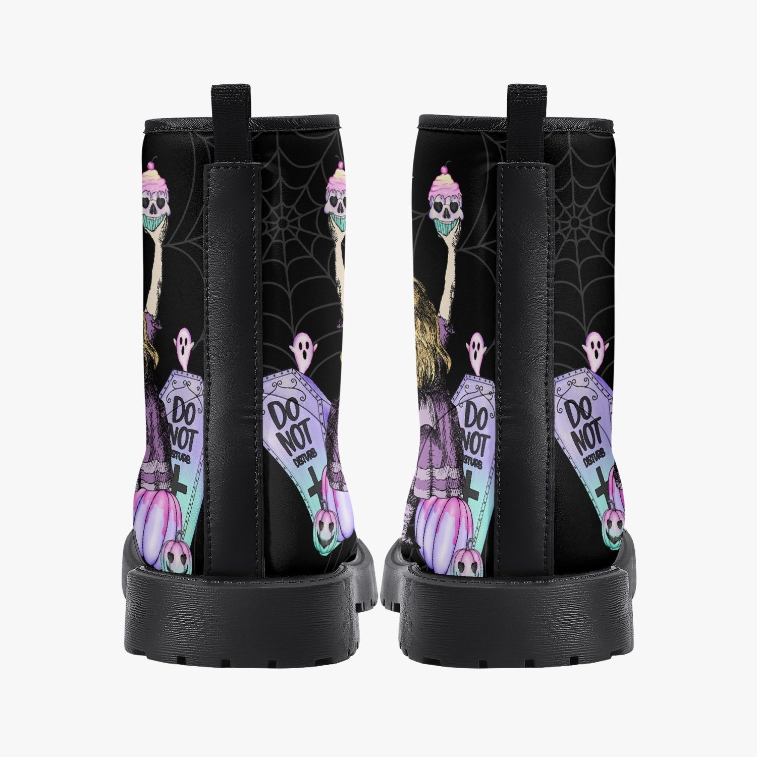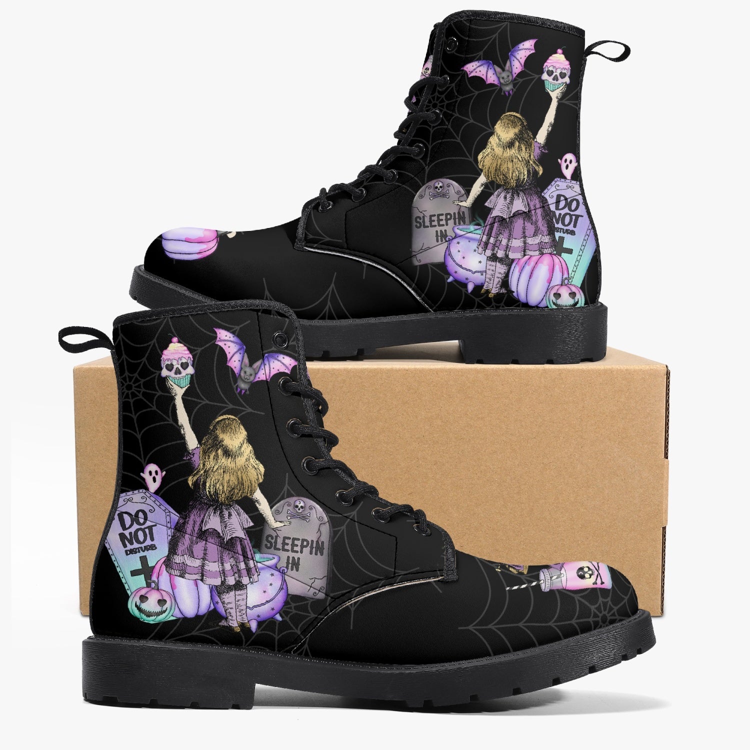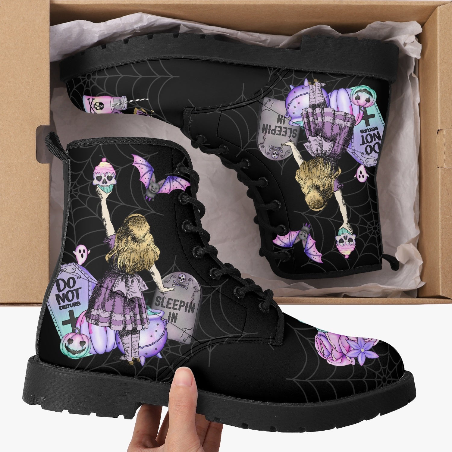 Pastel Goth Alice in Wonderland. Awesome combat boots which are super comfortable. This fun gothic Alice design showcases Alice surrounded by pastel goth imagery. Cauldrons, bats, ghosts, coffins, gravestones, you'll find the White Rabbit and Cheshire Cat in there too.