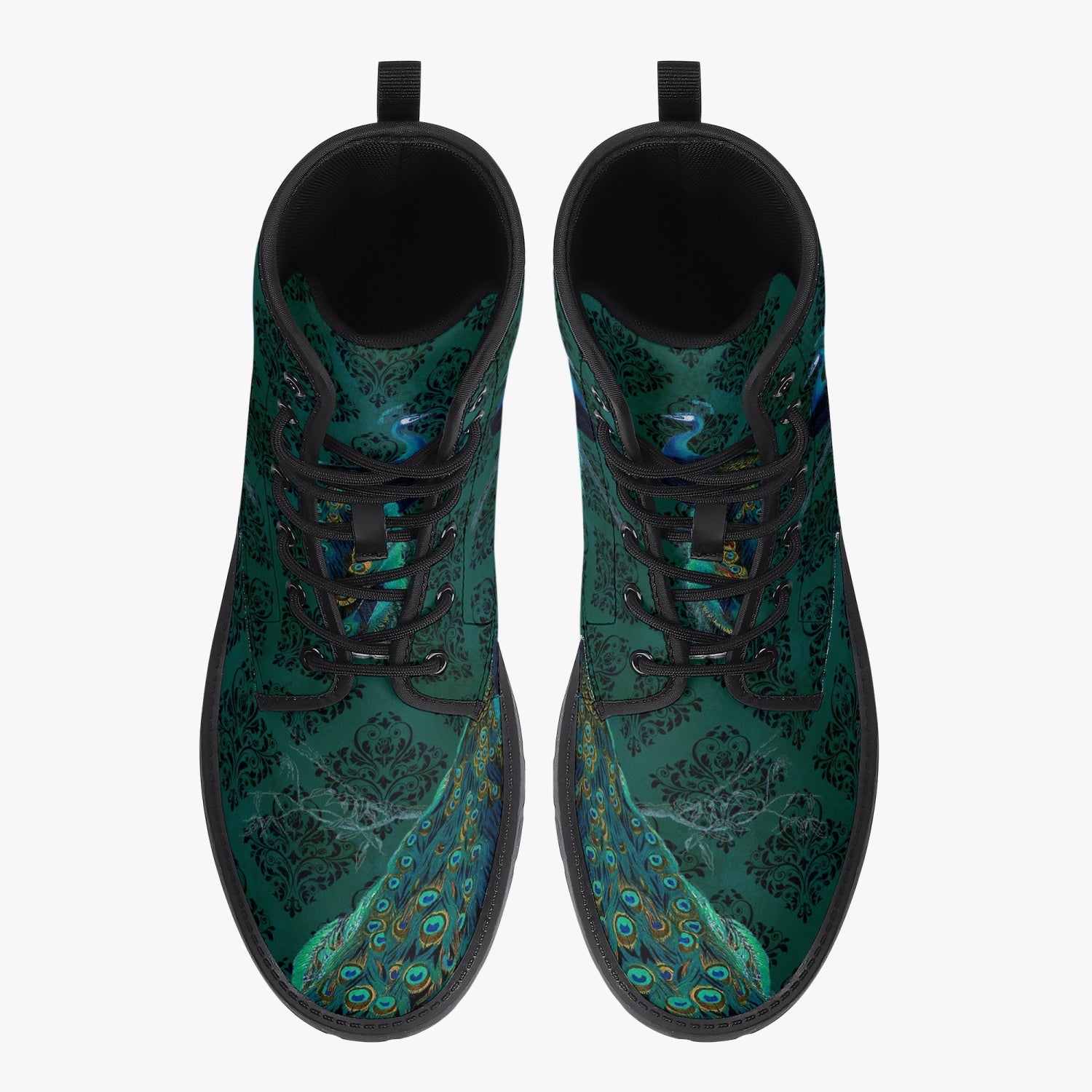 A gorgeous green and turquoise Peacock pattern custom printed on super comfy combat boots.