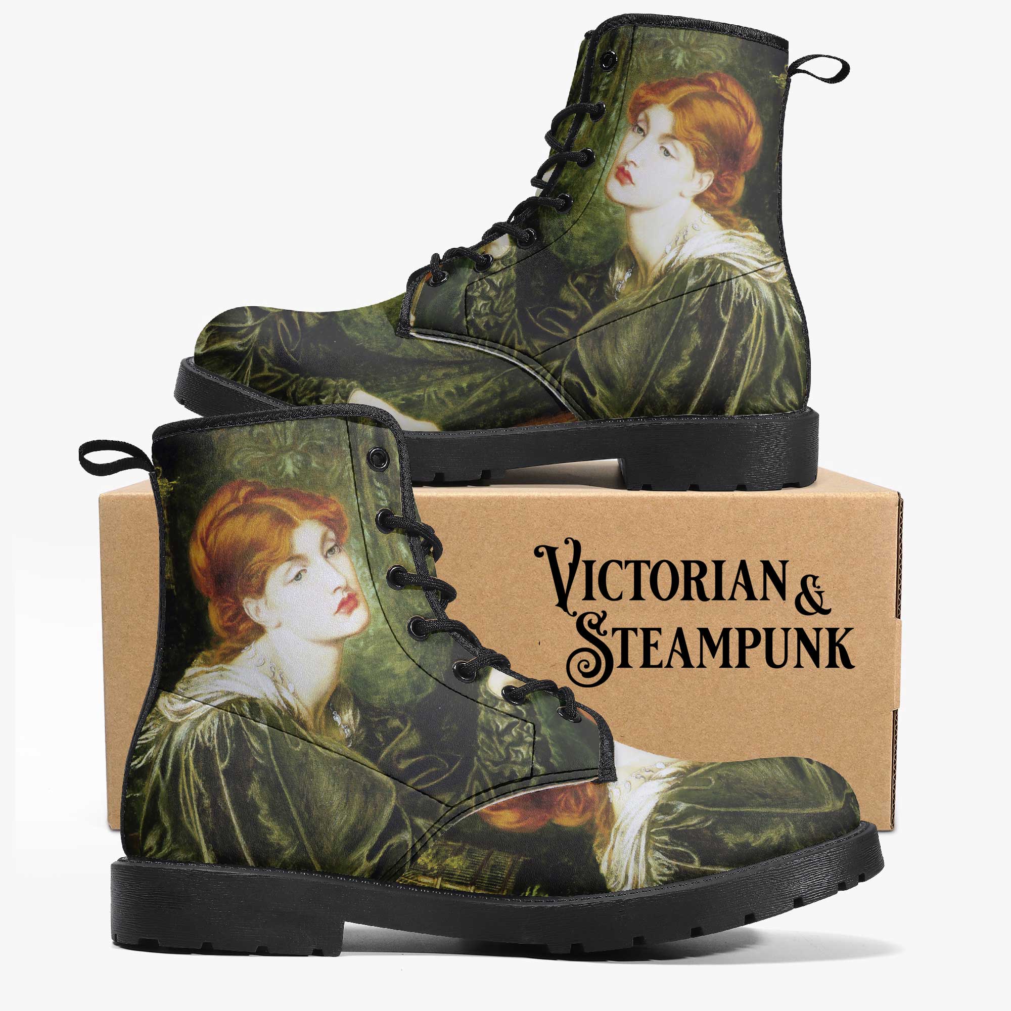 For lovers of the Pre Raphaelite Brotherhood, the beautiful painting by Dante Gabriel Rosssetti of Veronica Veronese custom printed of super comfy vegan friendly combat boots.