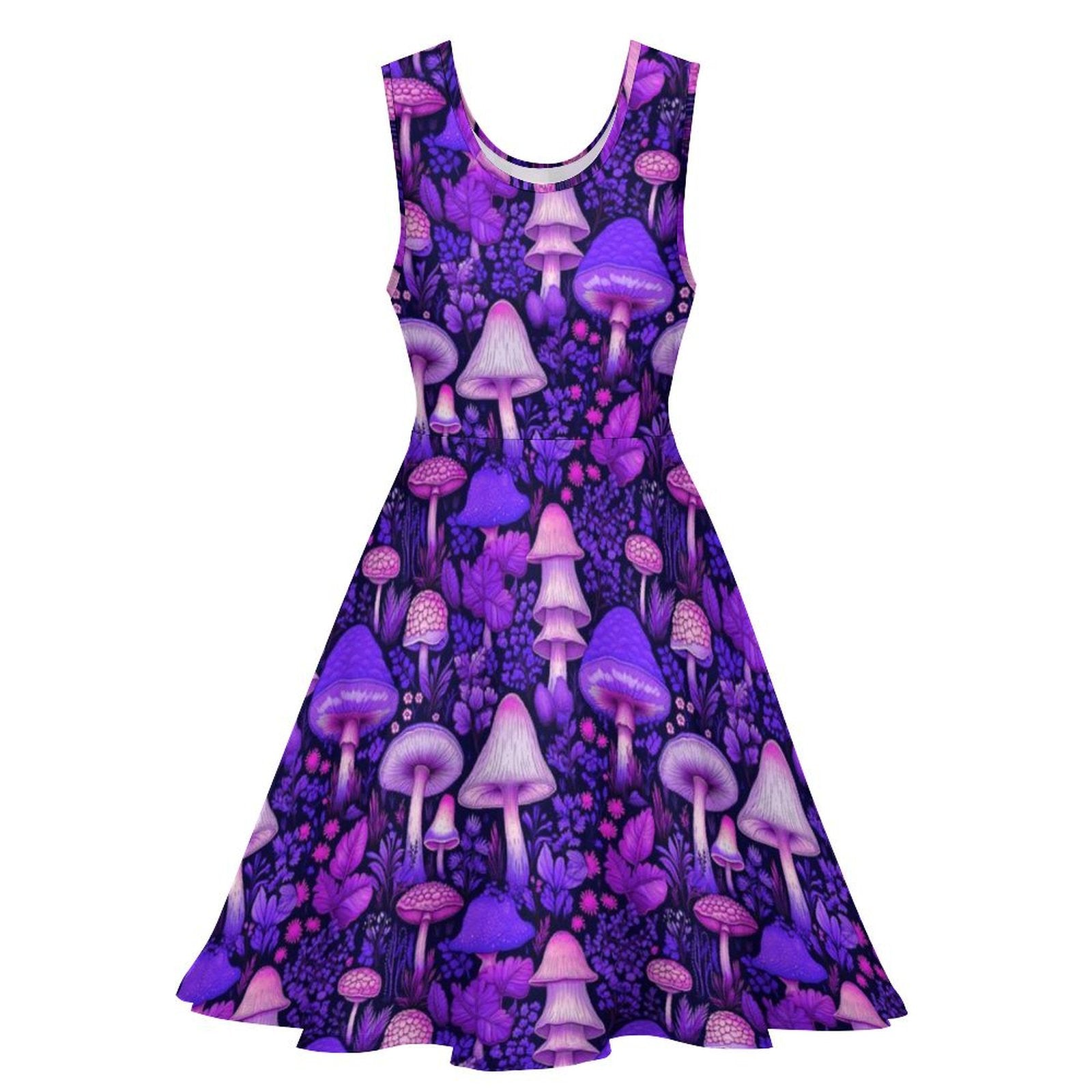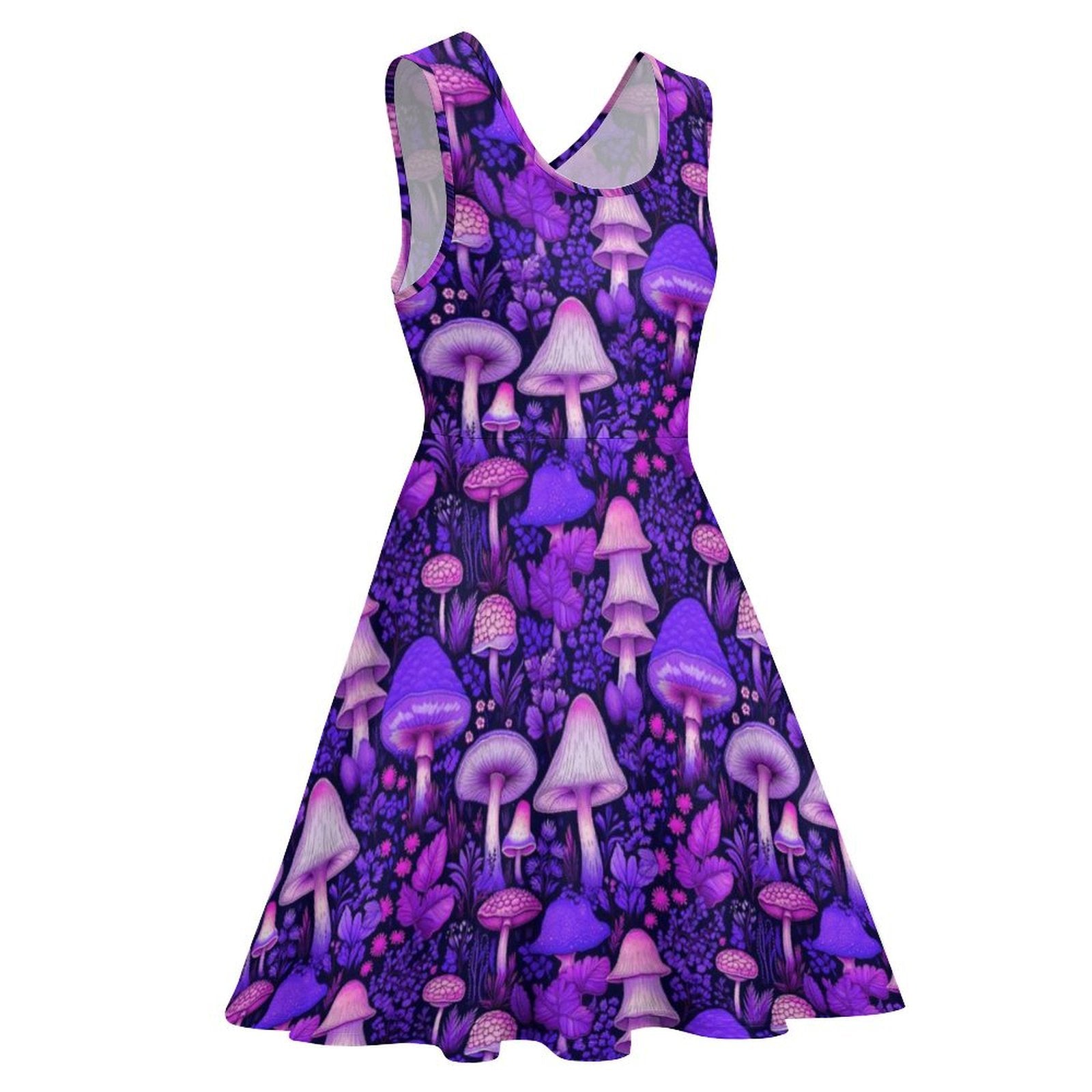 This fun sleeveless dress is custom printed with a glorious spread of purple and pink mushrooms, bringing serious mushroomcore energy to your wardrobe.