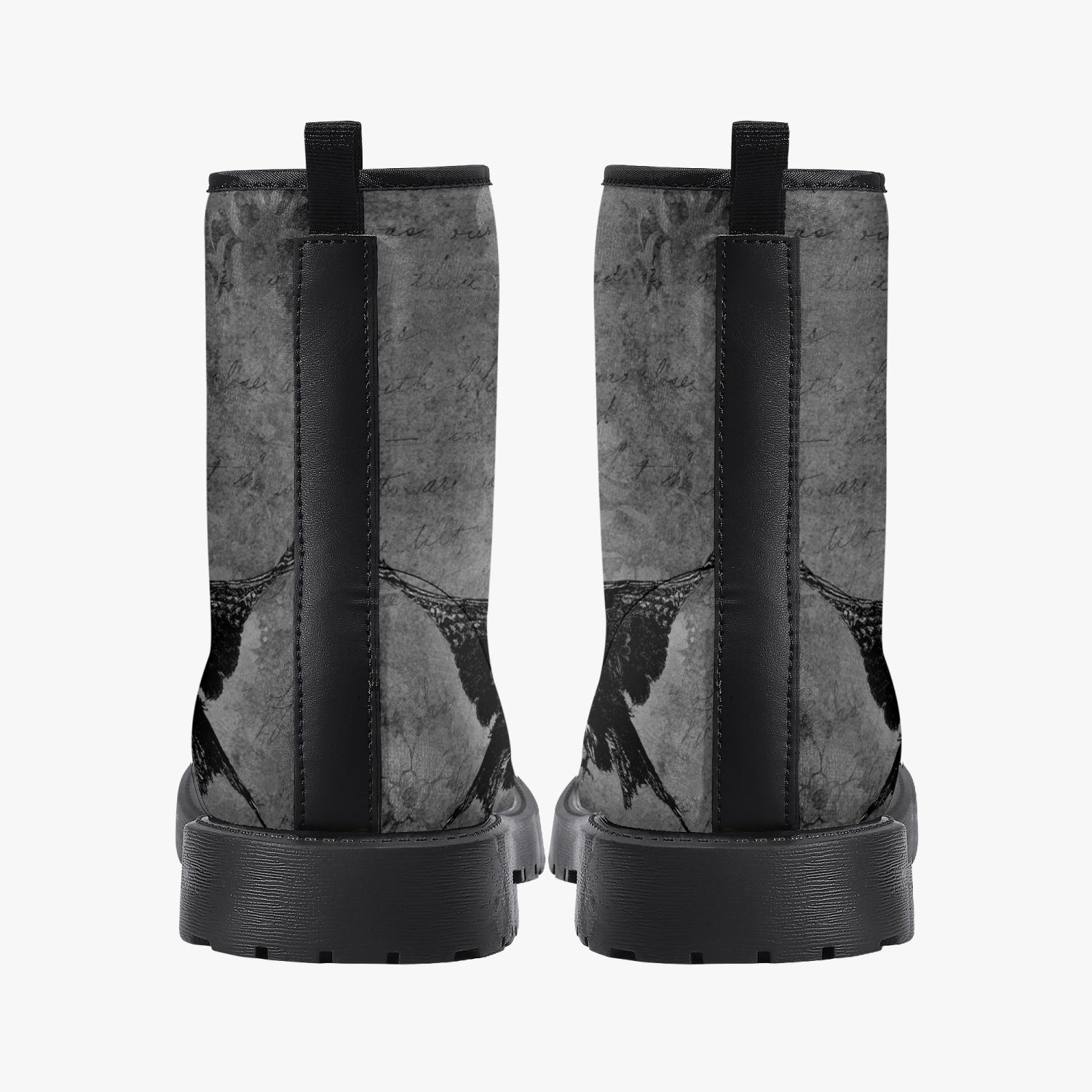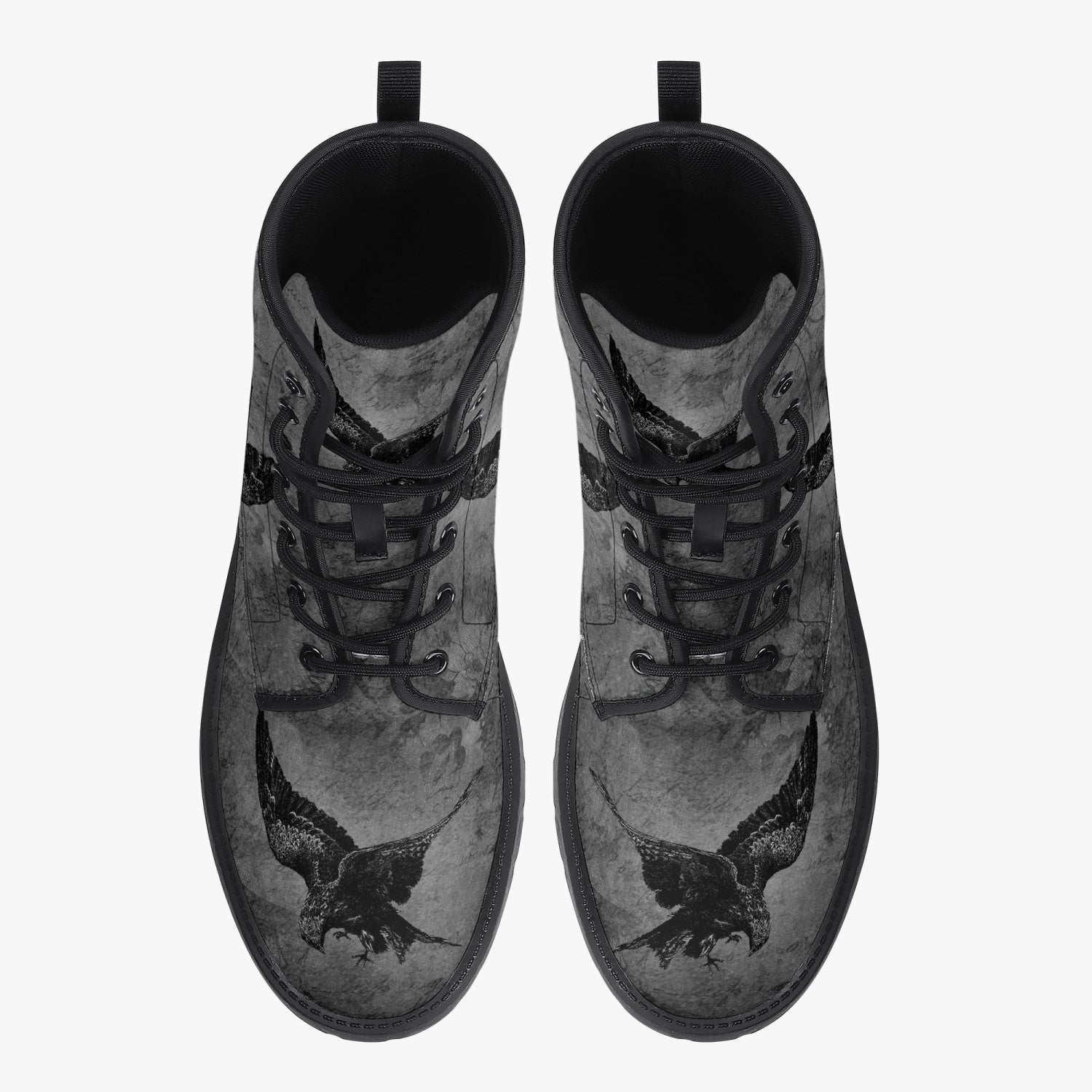 A black and grey  gothic design with swooping Ravens custom printed on super comfy, high quality combat boots.