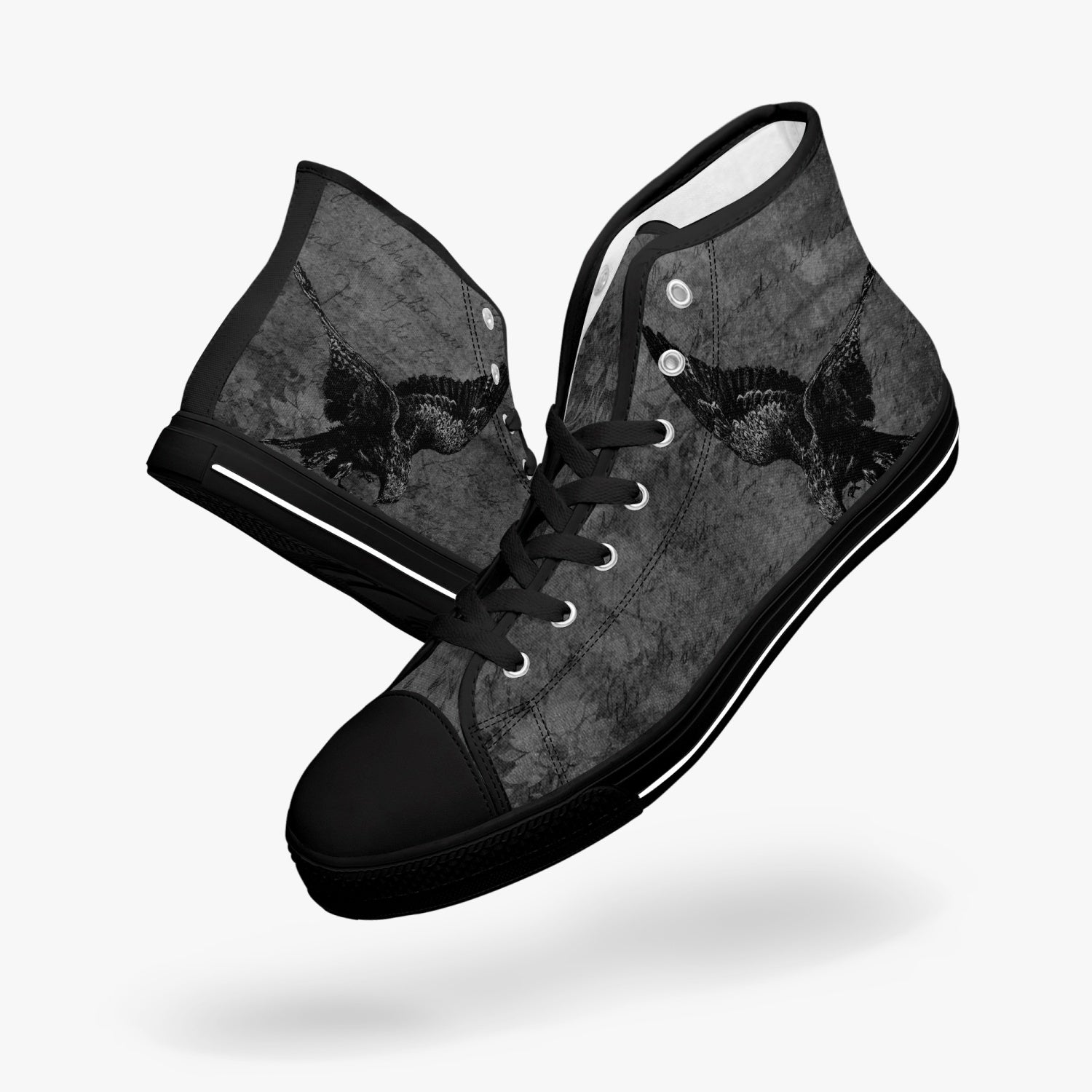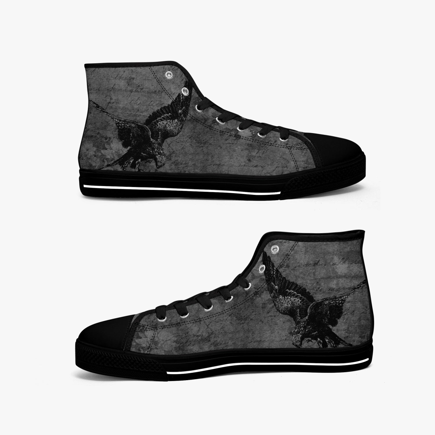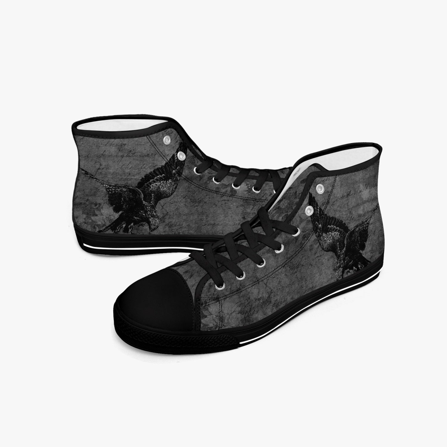 For lovers of Edgar Allen Poe - High quality sneakers printed with the iconic Raven on a gothic vintage style background in red and black.    Awesome Gothic Hi Tops. Click to buy.