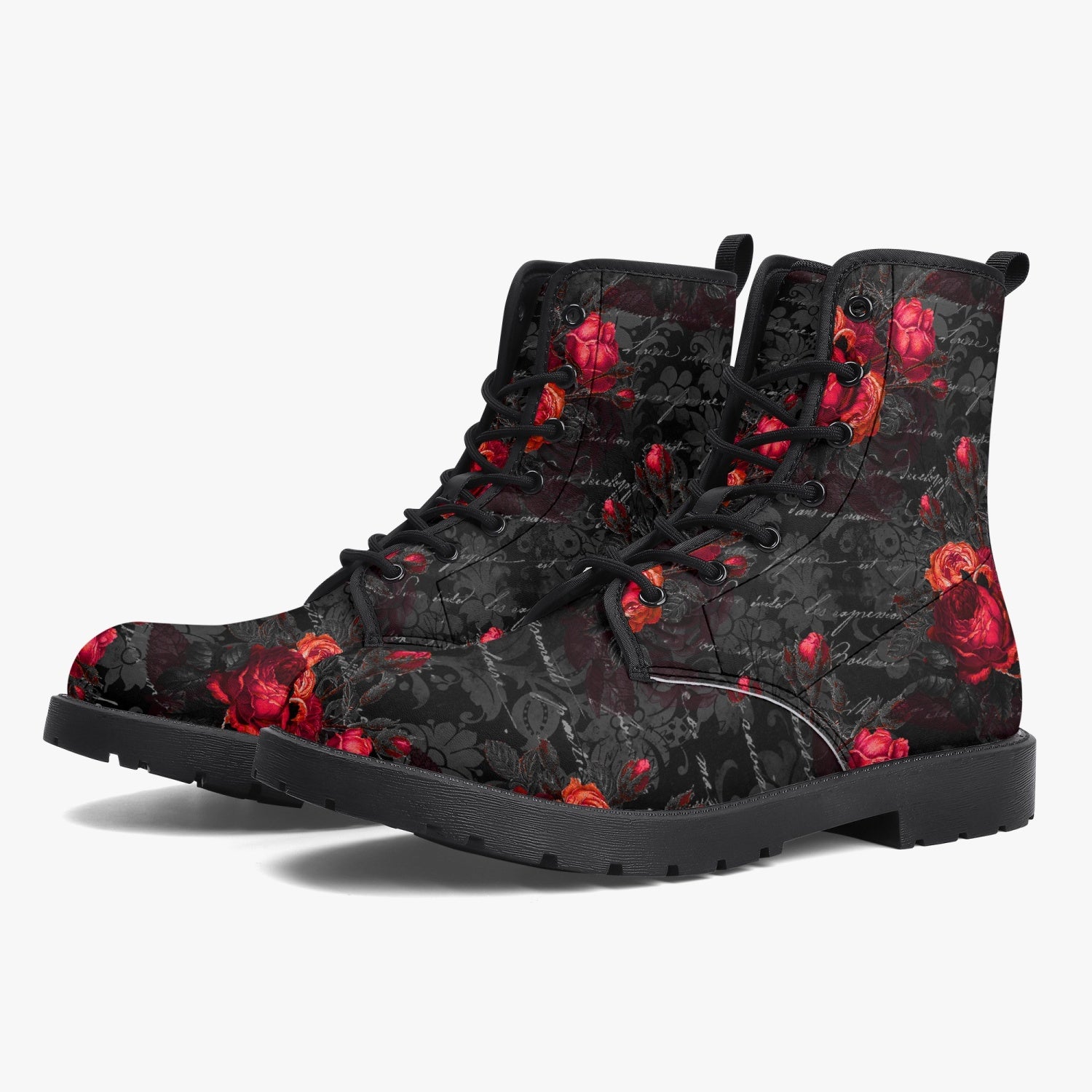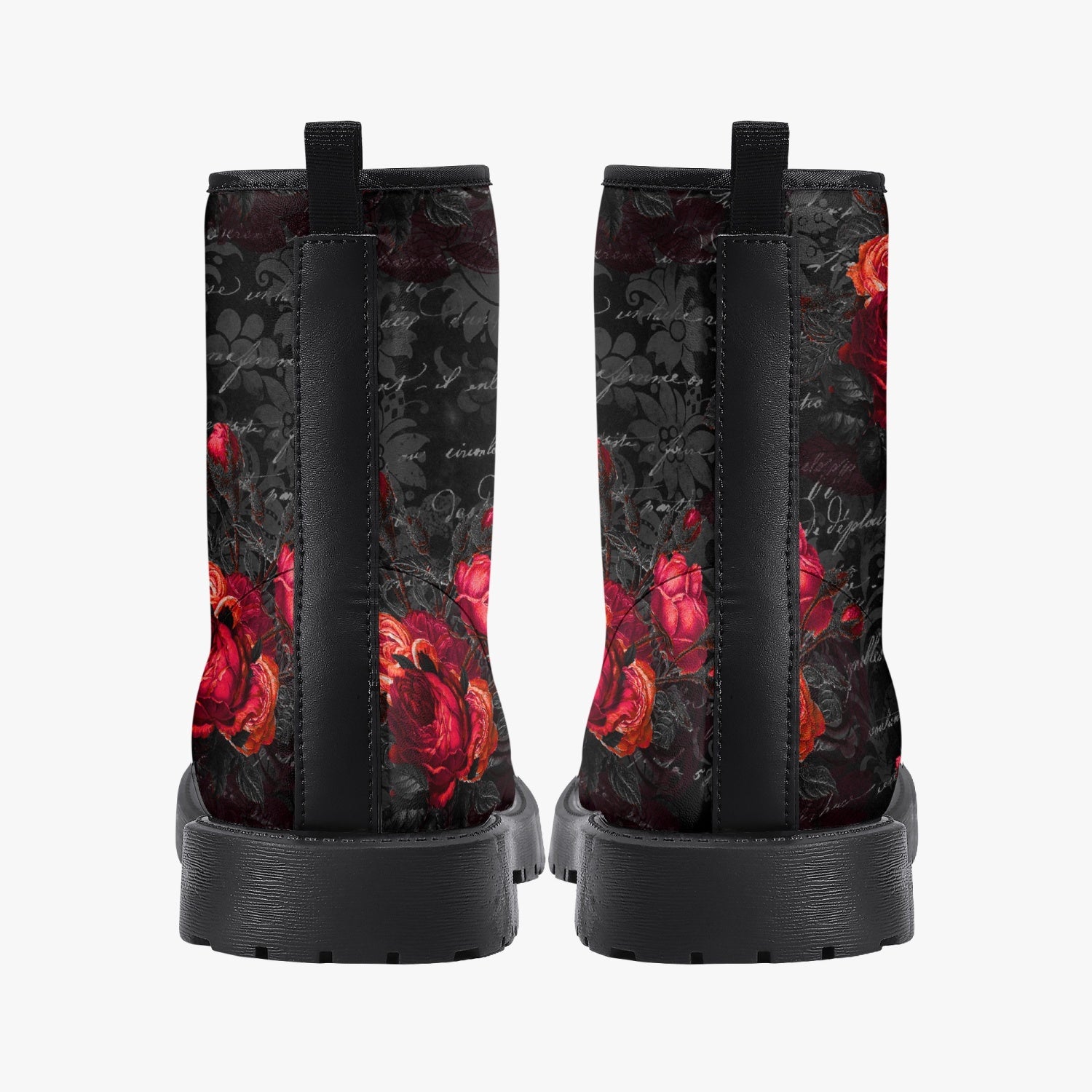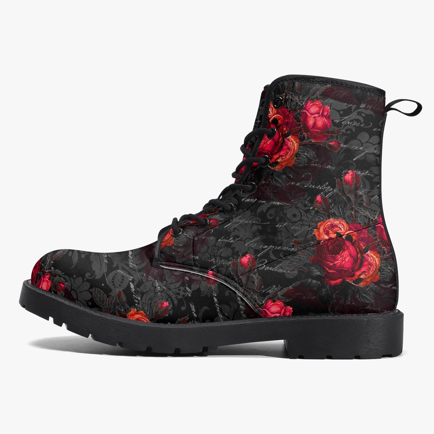 Red Roses and vintage writing decorate these super comfy combat style boots.