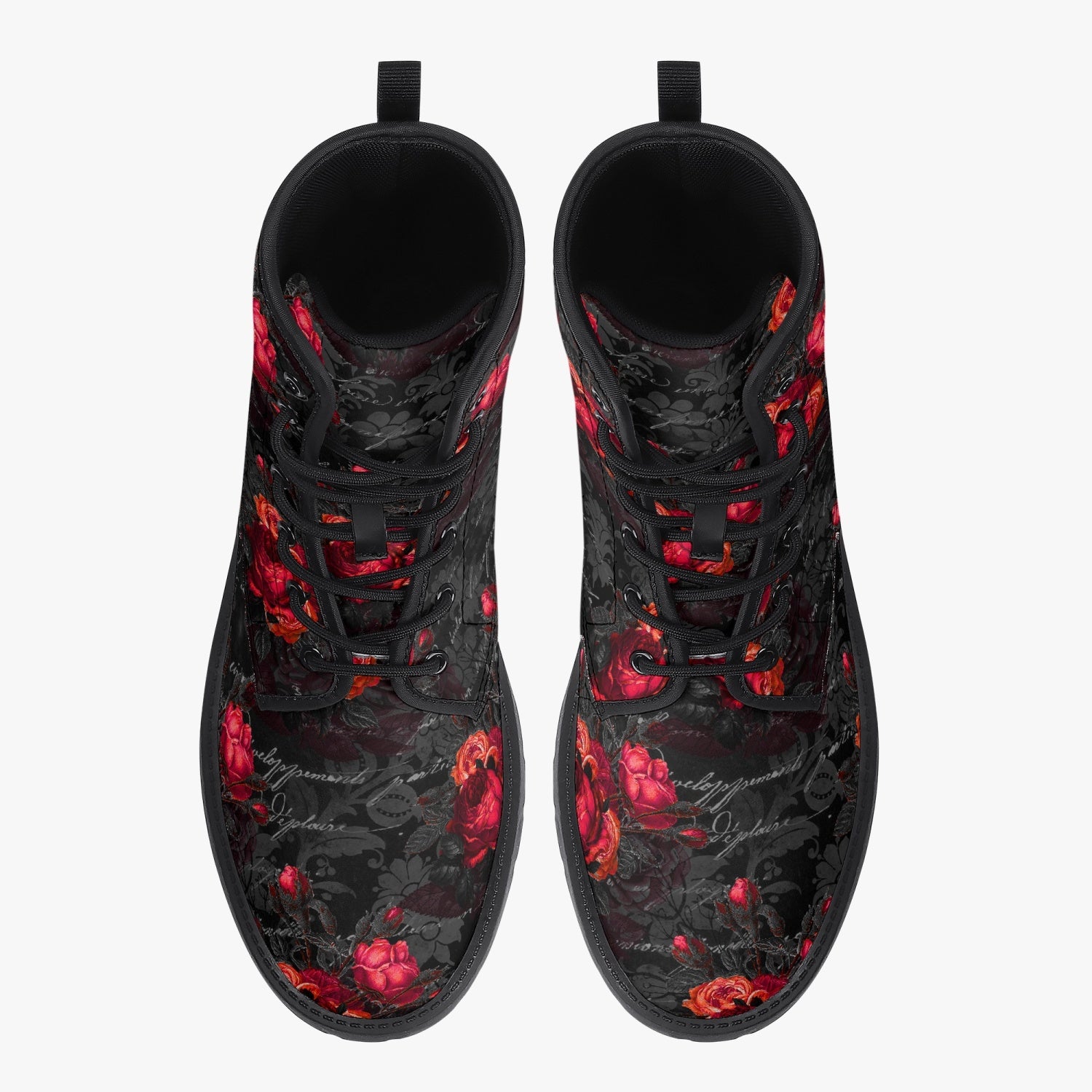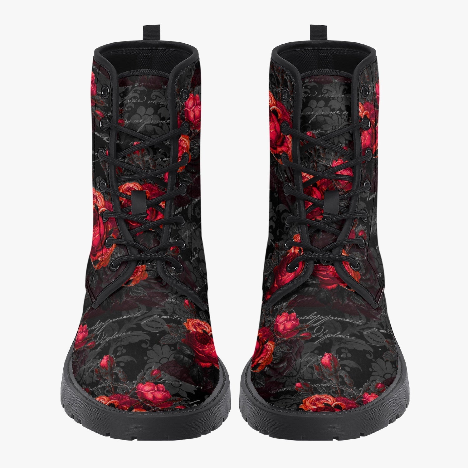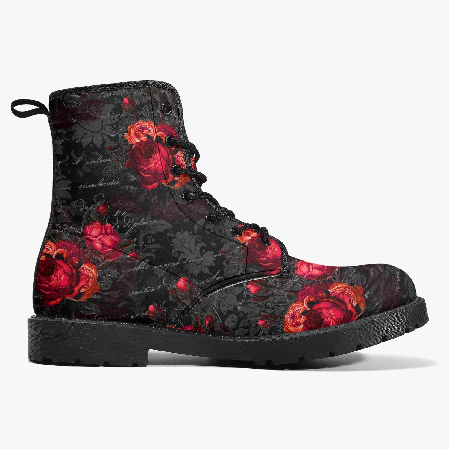 Red Roses and vintage writing decorate these super comfy combat style boots.
