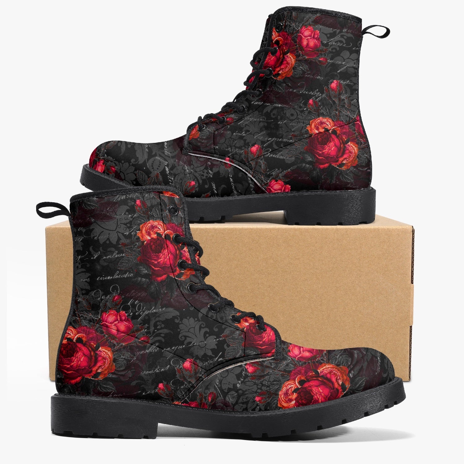 Red Roses and vintage writing decorate these super comfy combat style boots.  These boots are great for...