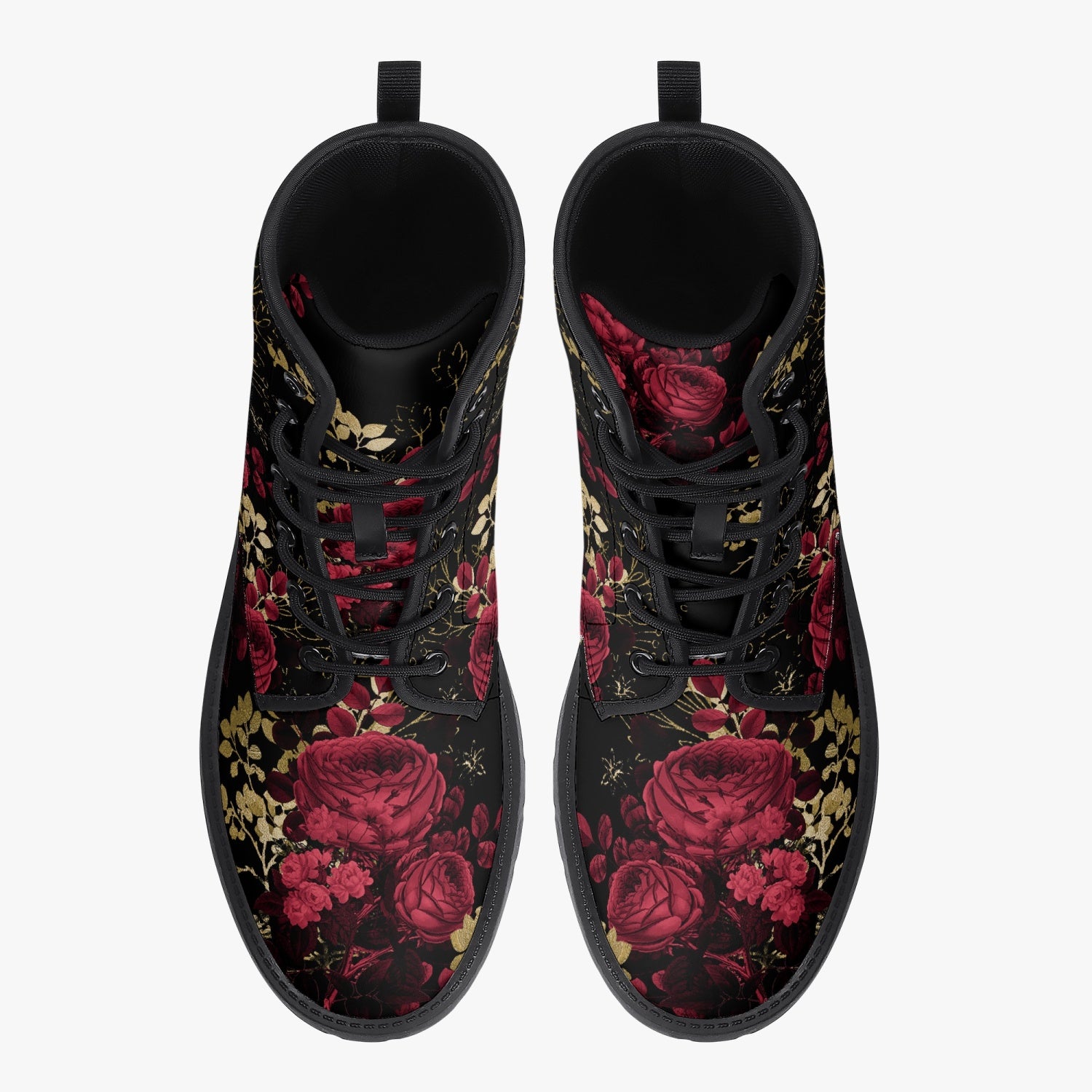Beautiful red roses floral print custom printed on super comfy Combat boots.  A deliciously gothic floral design....