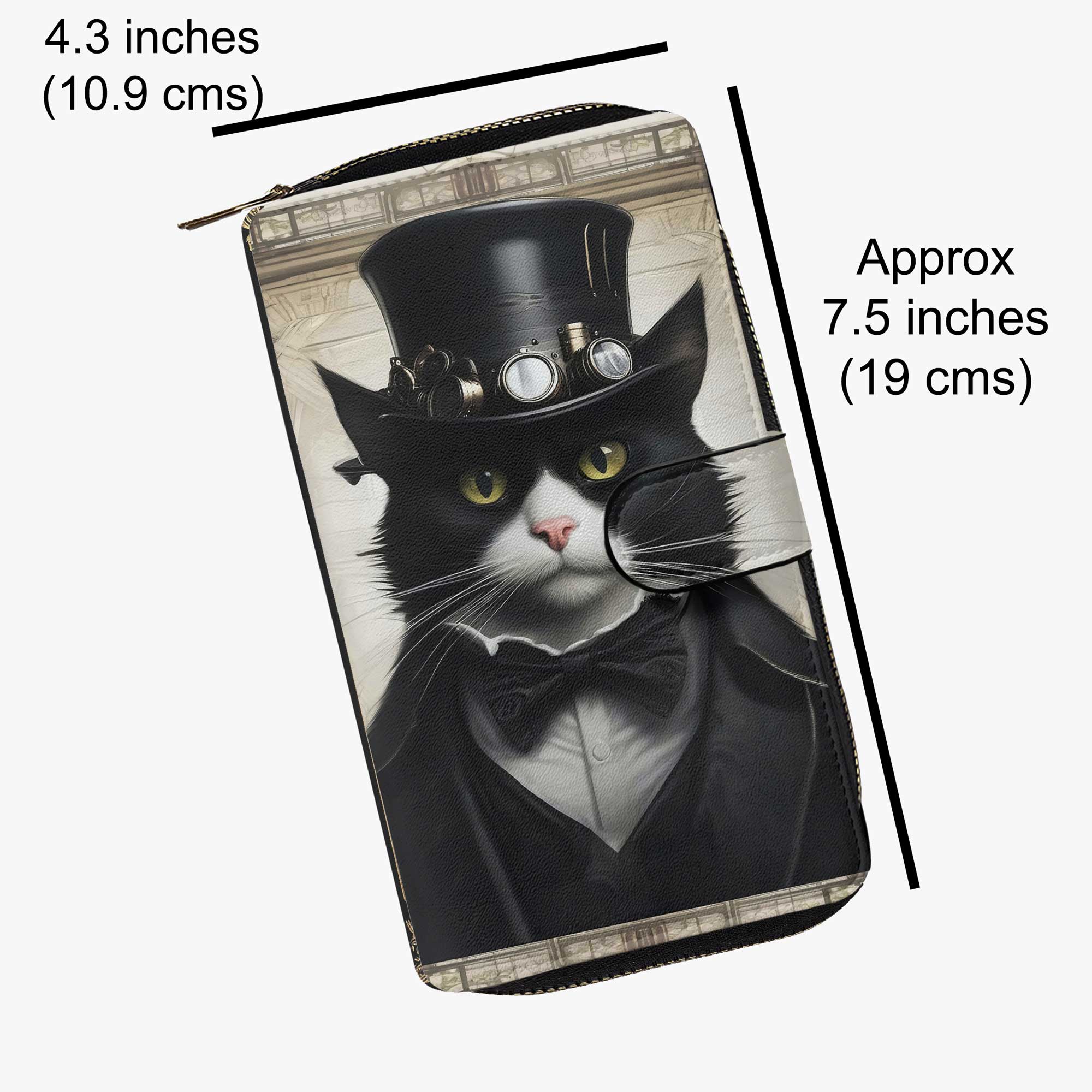 Steampunk Fans will love this large zippered wallet featuring our egnimatic Steamcat.