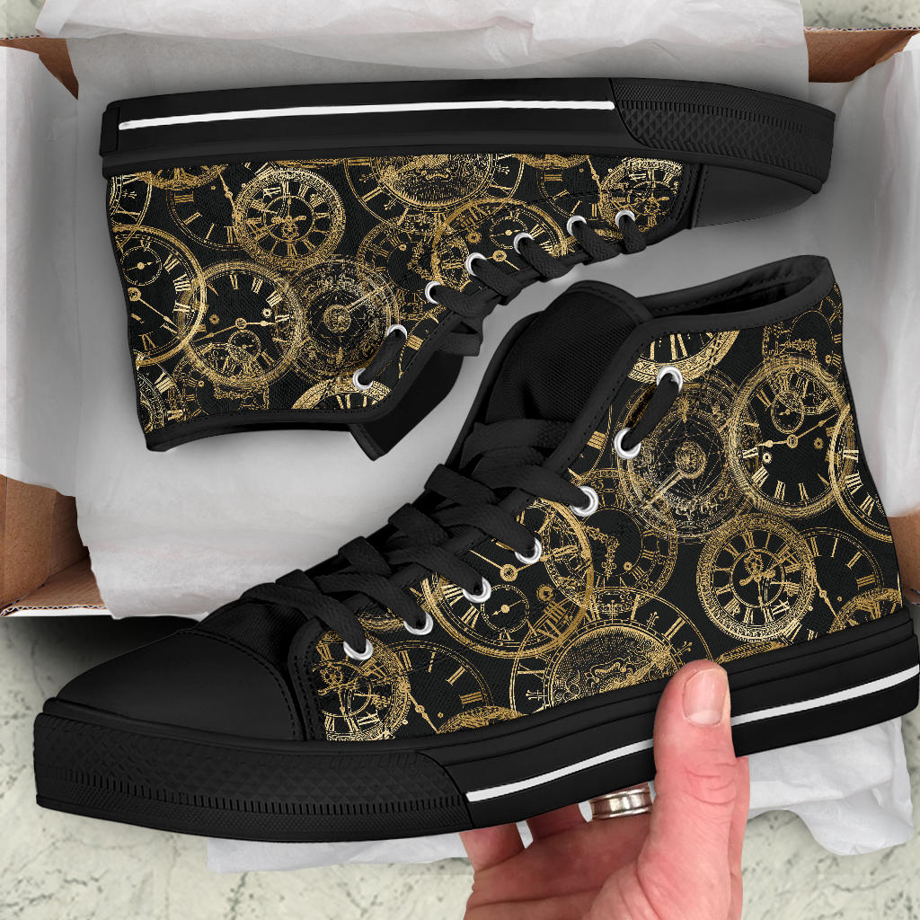 Cool Steampunk hi top sneakers - The premium high top sneakers have a custom print on golden clocks.