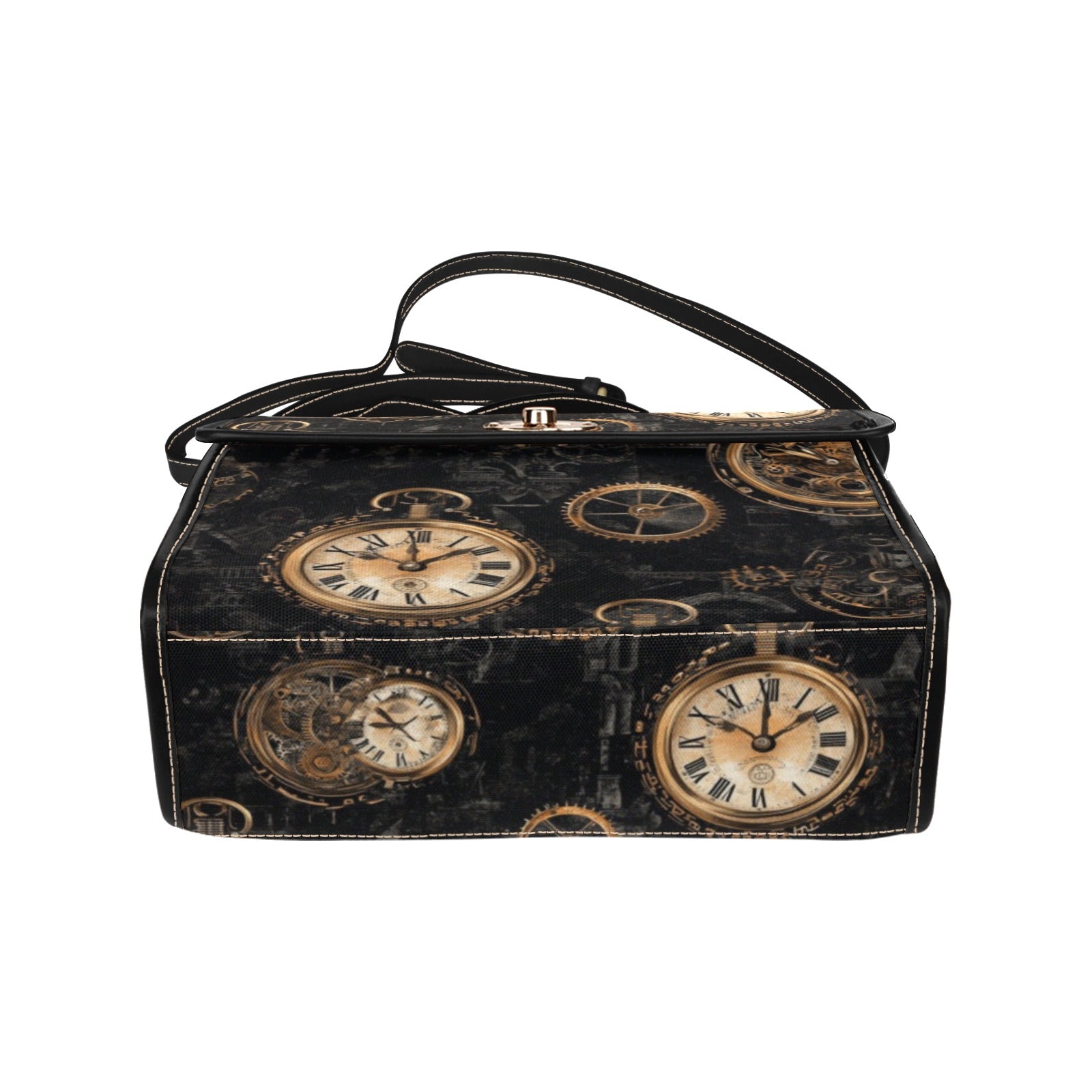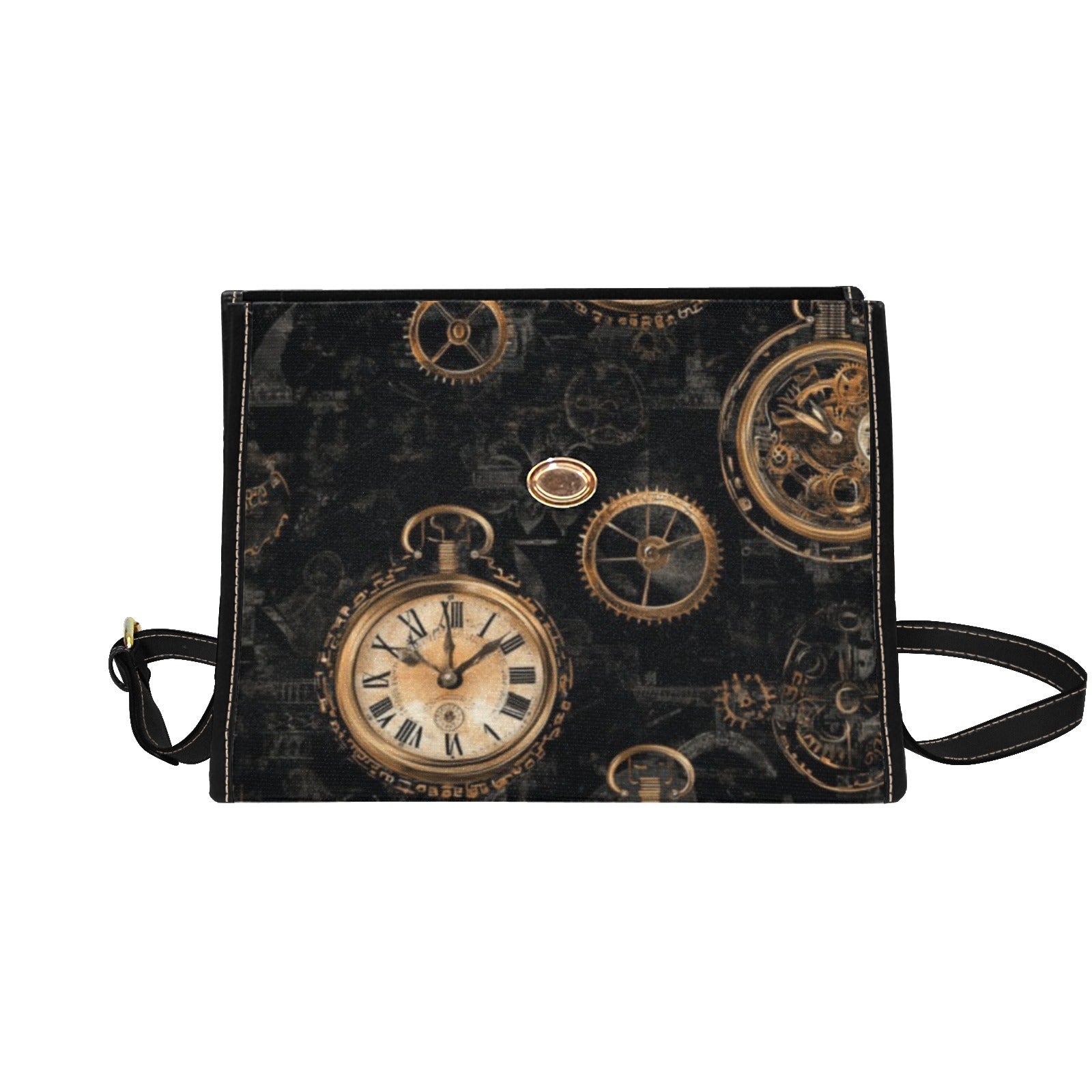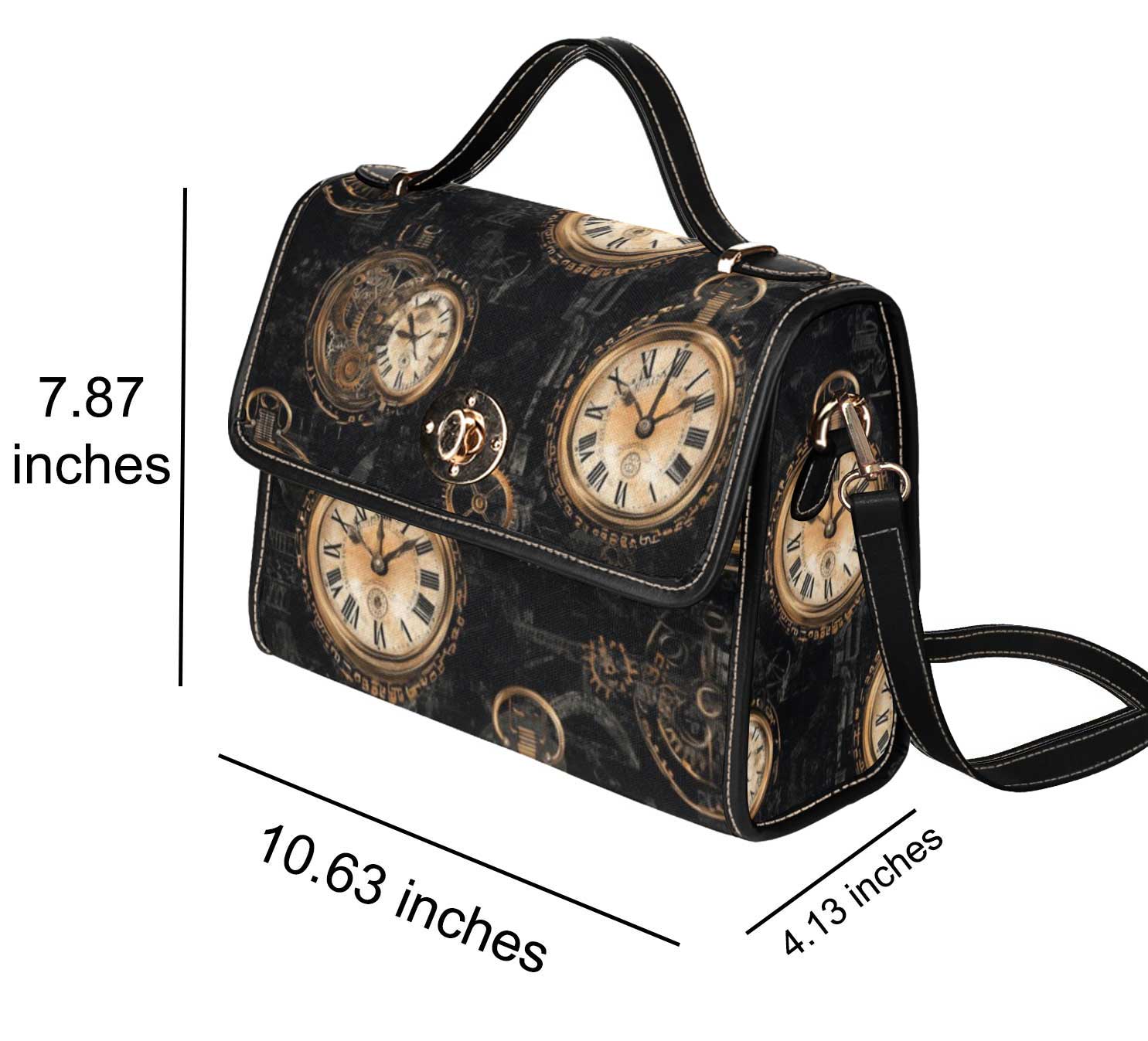 Featuring a mesmerizing custom print of intricate clockworks and gears in rich gold and black tones, this bag is perfect for steampunk enthusiasts, cosplayers, and anyone who loves a touch of Victorian-inspired adventure.