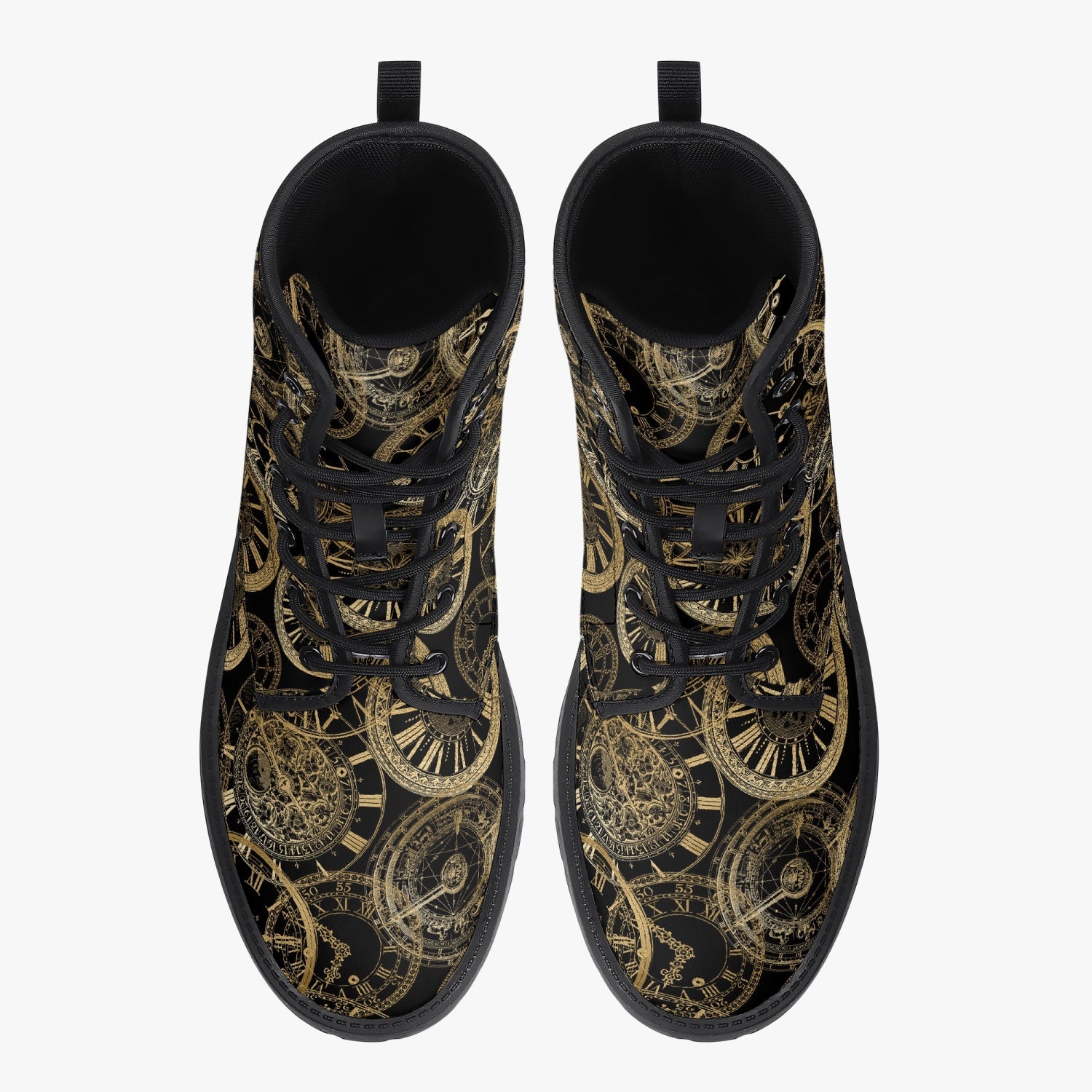 Steampunk golden clocks combat boots, perfect for Steampunk festivals and other events.