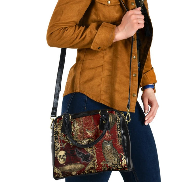 Gorgeously gothic Steampunk handbag in deep reds and gold tones - Some of the features of this custom design are: Vintage writing, owls, skulls, ravens, airships, penny farthing bicycles.  A truly unique steampunk accessory.