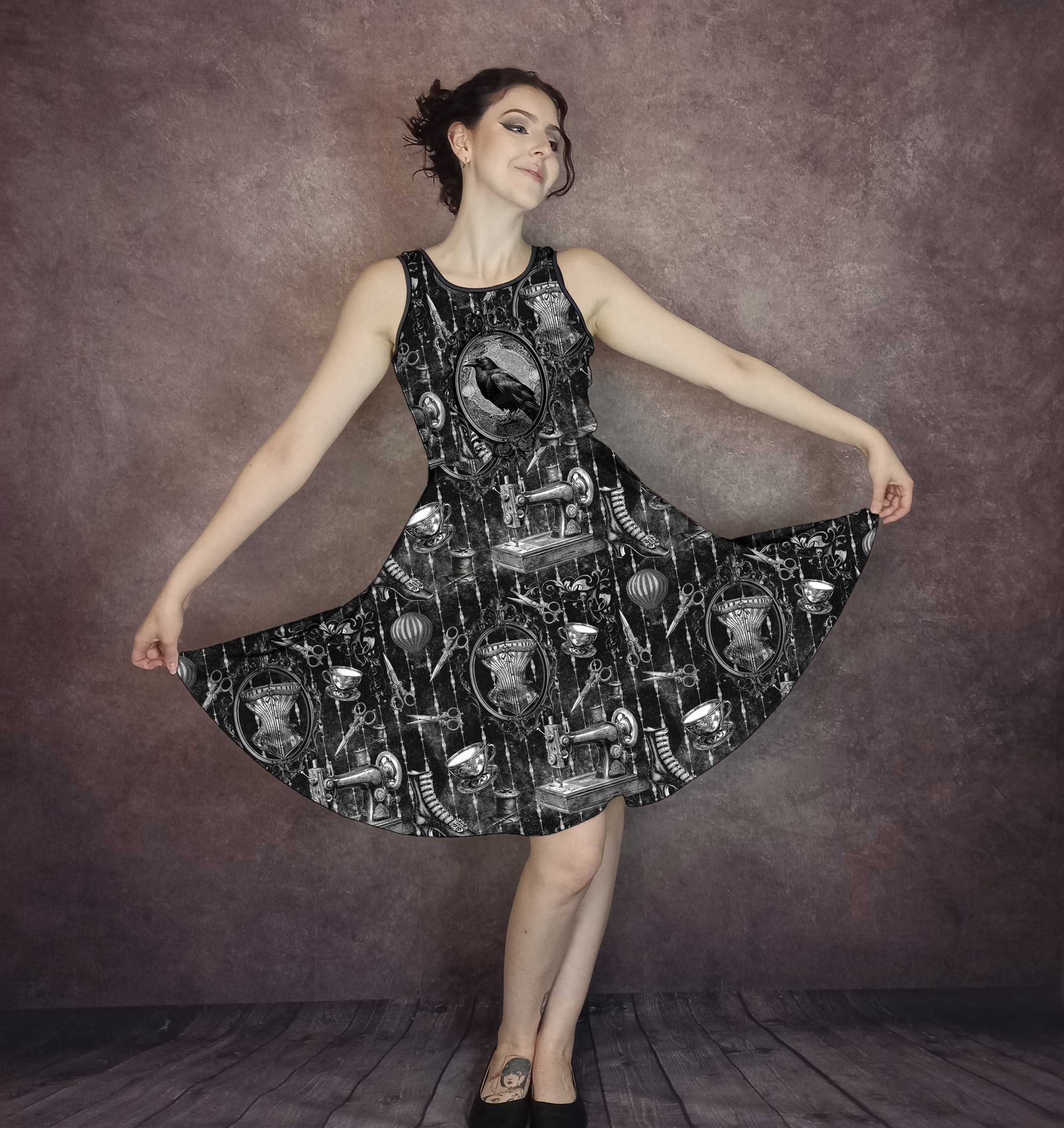 Featuring all the good stuff like corsets, sewing machines, teacups, sewing scissors and of course an epic Raven.  All in delightful gothic tones.