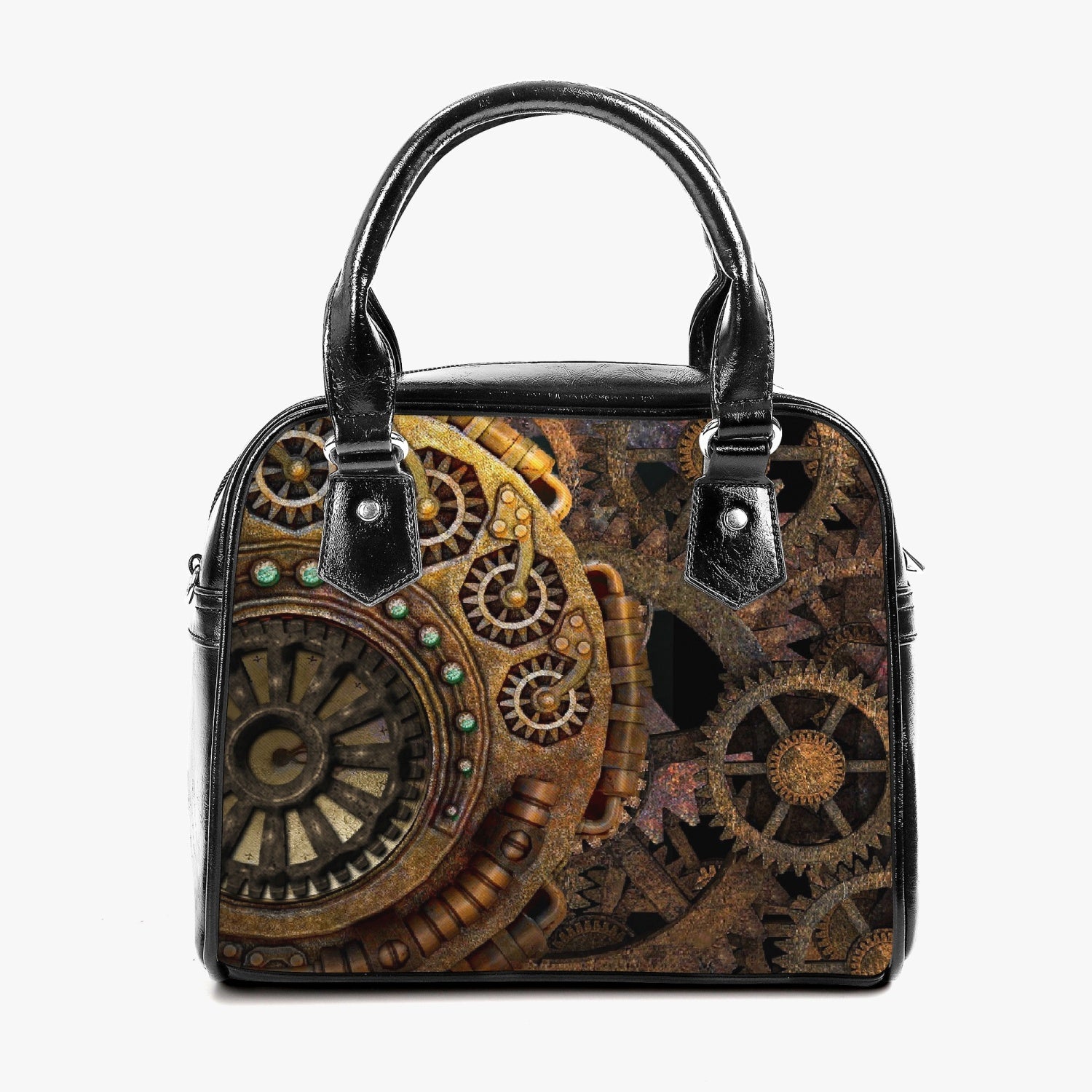 steampunk handbag with black handles and shoulder strap.  Features a print of bronze and gold toned clockwork gears.  Shoulder purse is approximately 9 inches wide and 8 inches high