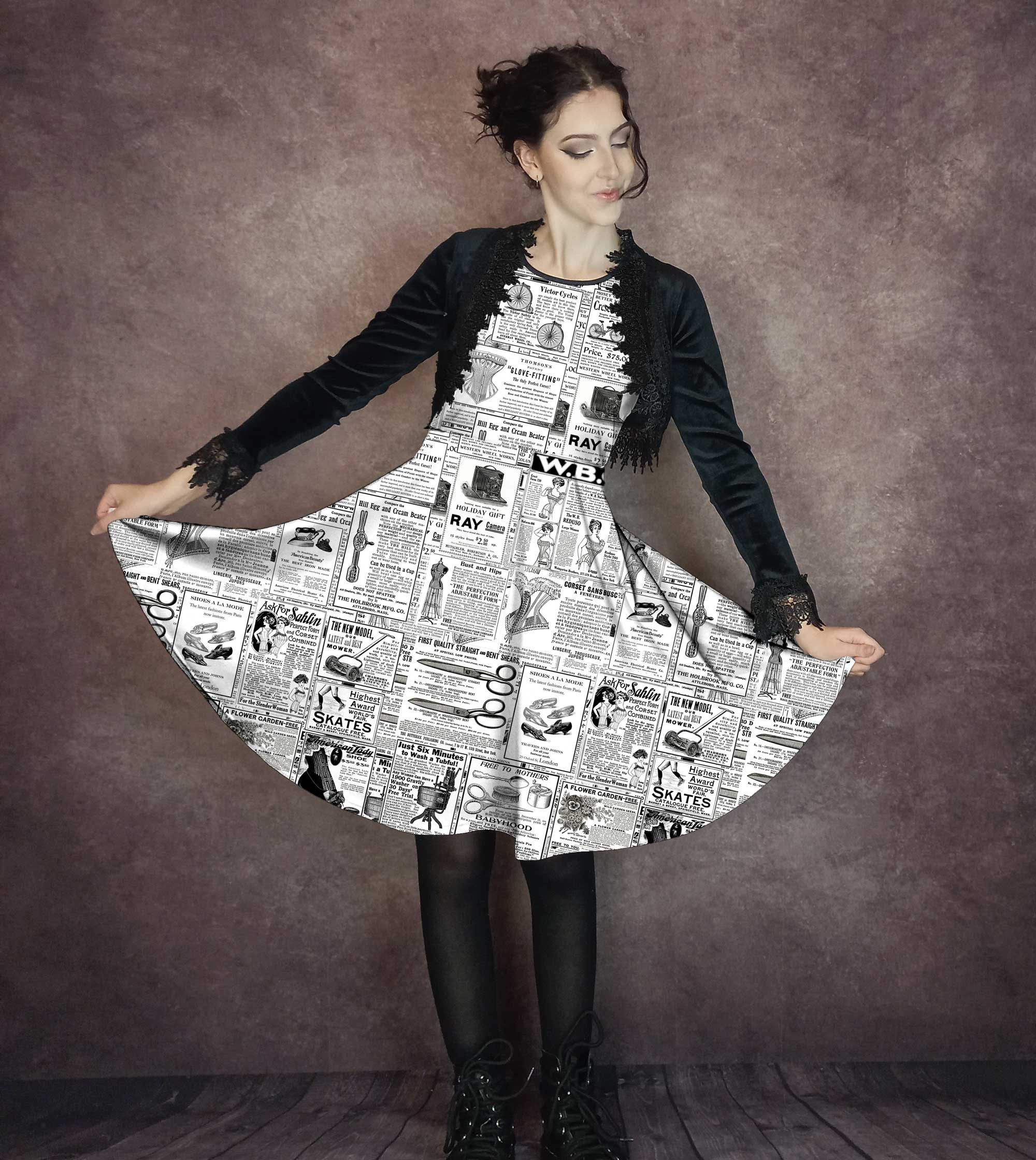 A delightful, quirky fun dress custom printed with vintage newspaper advertisements.